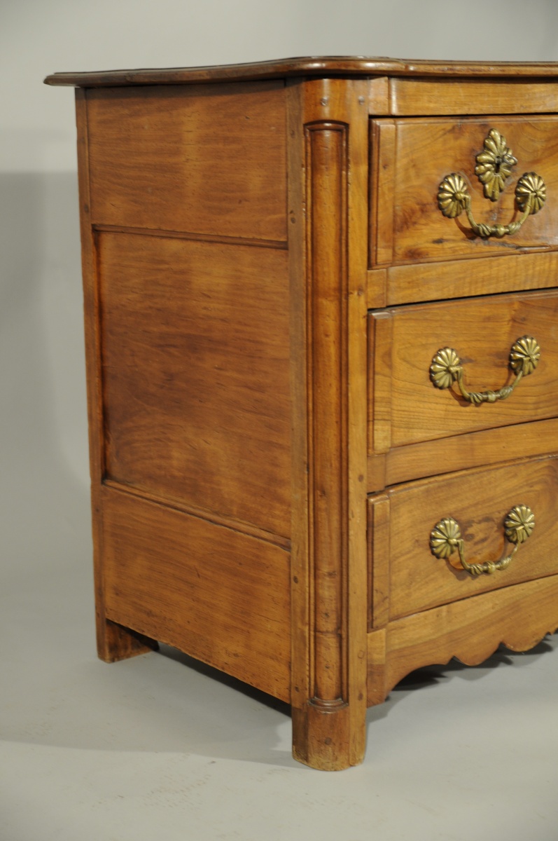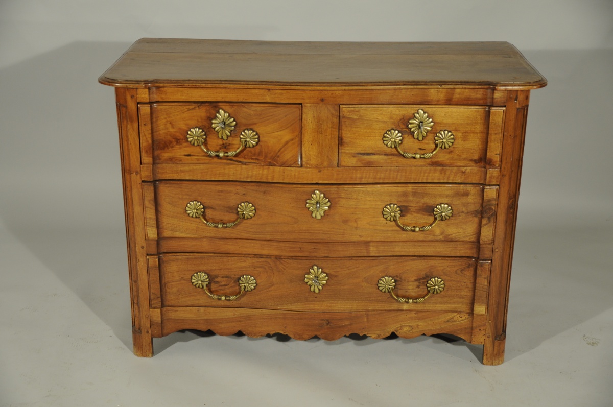 COMMODE à façade galbée en noyer teinté en ouvrant à quatre tiroirs sur trois rangs. Traverse mouvementée. Pieds droits moulurés à pans coupés. Garnitures de bronze ciselé et doré telles que, poignées tombantes et entrées de serrure à décor rayonnant.