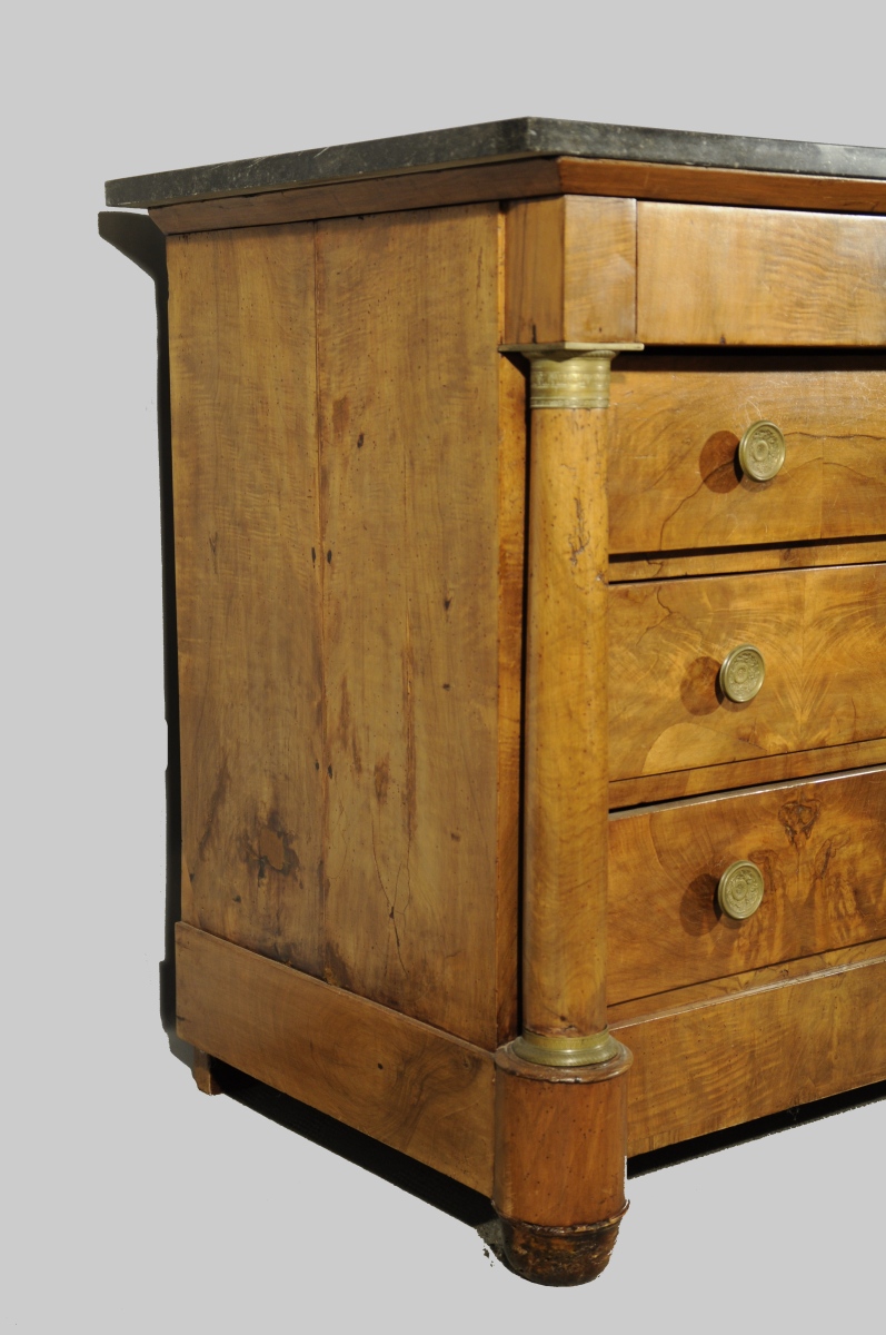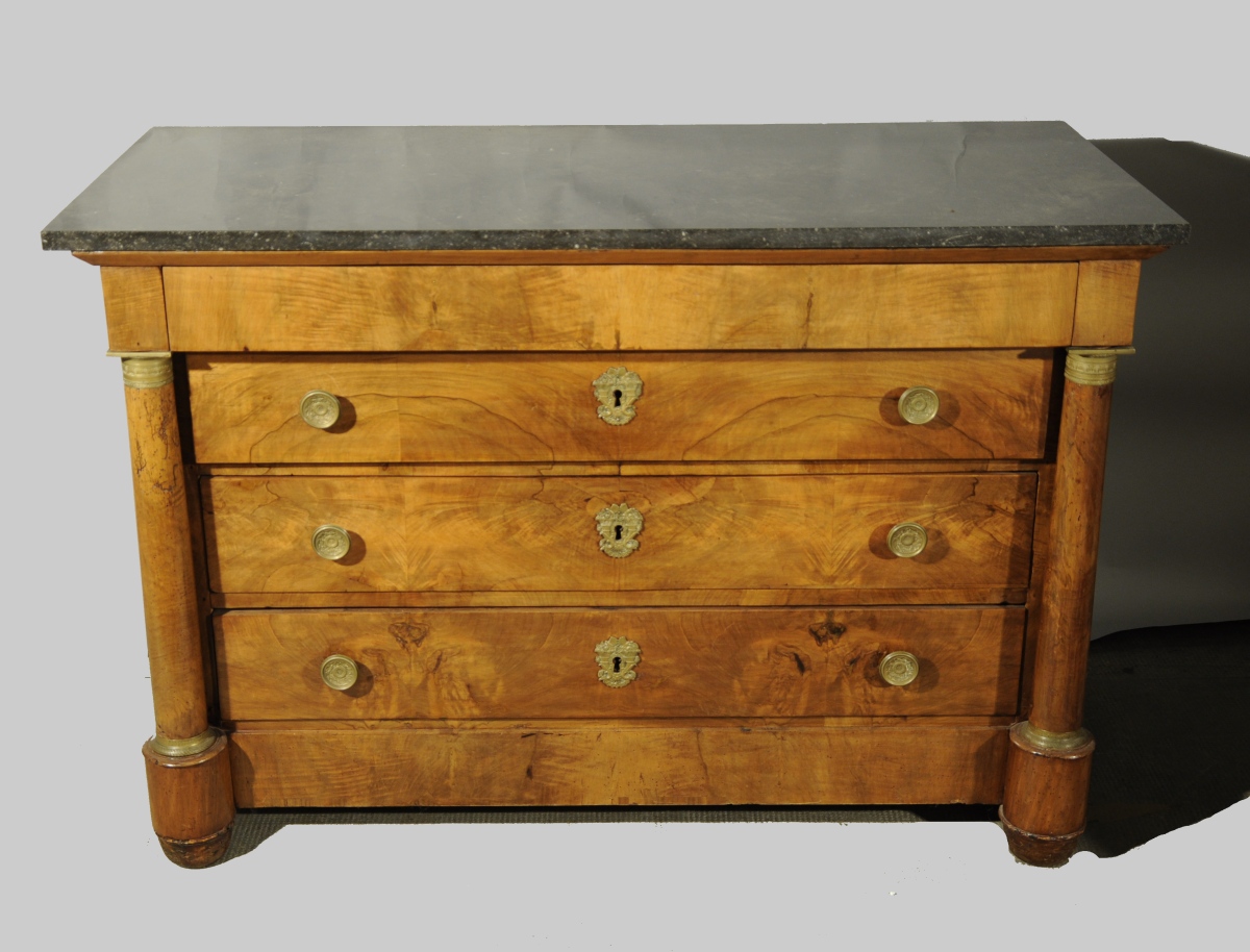 COMMODE en noyer et placage de noyer. Elle ouvre par quatre tiroirs, dont un en ceinture. Façade à colonnes détachées reposant sur des pieds ronds. Garnitures de bronze ciselé et doré, telles que poignées rondes, entrées de serrures, bases et chapiteaux de colonnes. Dessus de marbre gris. Style Empire, XIXème. Haut. 87, Larg. 130, Prof. 60 cm. (trous de vers)