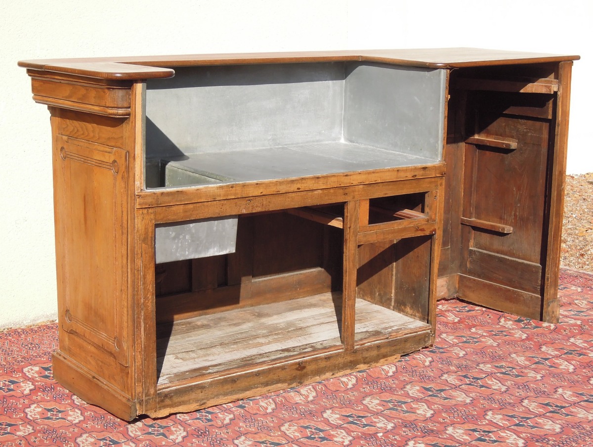 COMPTOIR DE BISTROT en chêne ciré et mouluré. Il présente sur l'arrière un décrochement avec un évier en zinc et des espaces de rangement. Plaque en laiton des "Établissements B.B.F" (Brassard, Bacquier et Frimbaud). Travail français. Début XXème. Haut. 118, Larg. 230,3, Prof. 70,5 cm. (petits accidents et manques)