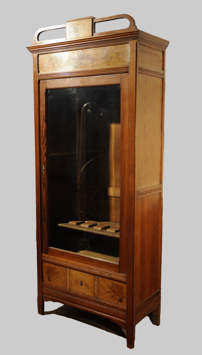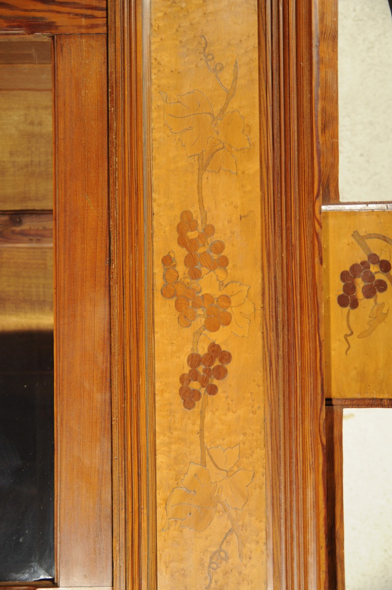 VITRINE de forme rectangulaire en pitchpin mouluré et placage de loupe marqueté de pampres de vigne en bois indigènes. Ouvre en façade par un porte vitrée et un tiroir en ceinture basse. Entrée de serrure en métal blanc ornée de rais de perle et stries. Corniche ajourée. Art Nouveau, dans le goût de Gallé. Haut. 219, Larg. 95, Prof. 42,5 cm.