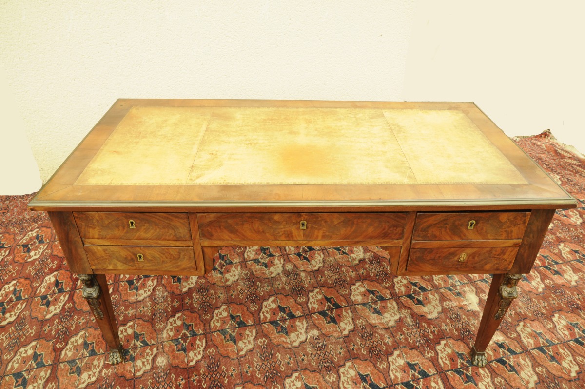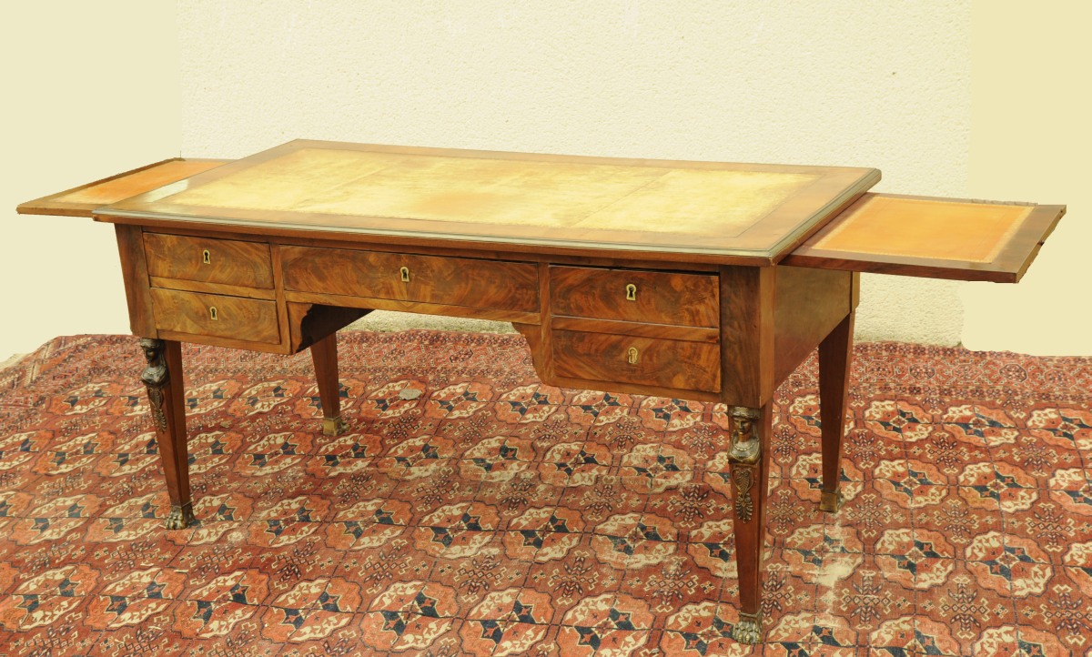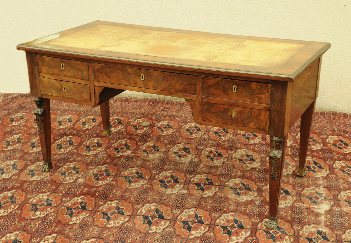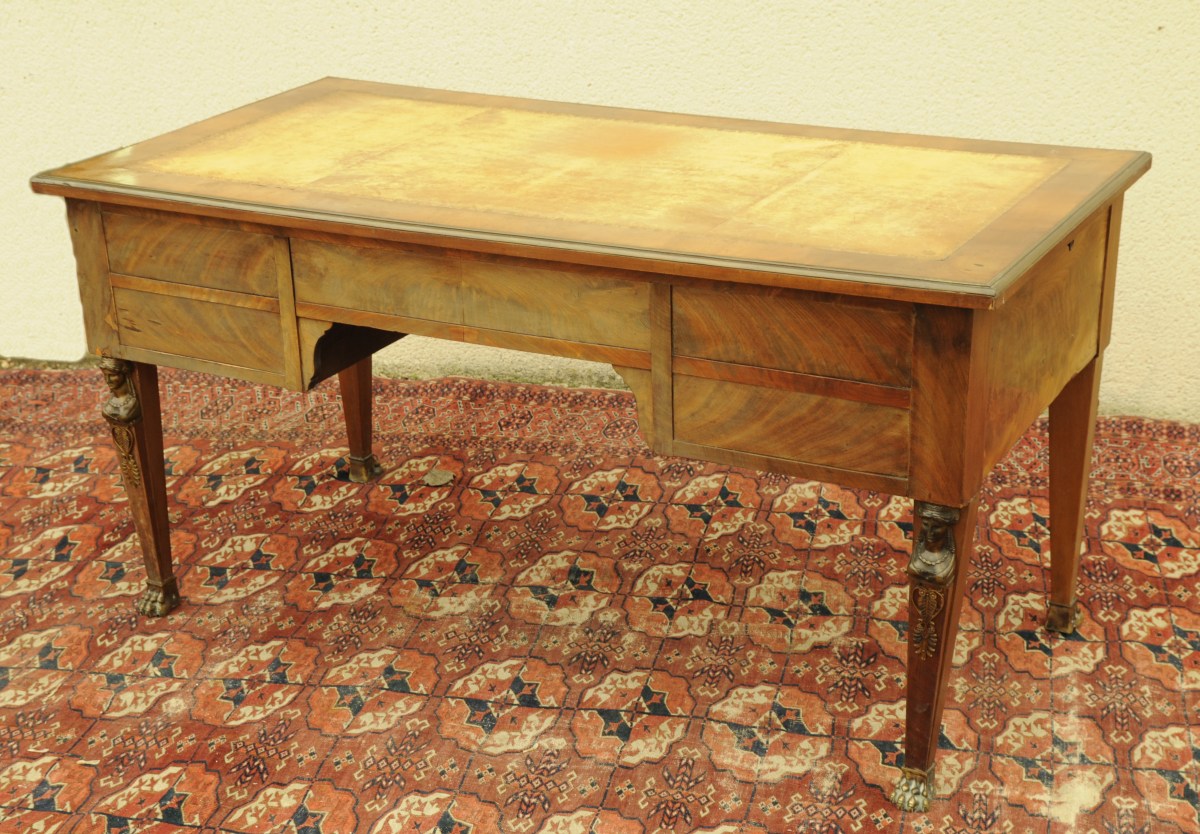 BUREAU plat en acajou et placage d'acajou flammé ouvrant à quatre tiroirs en façade, dont un double dissimulant une planchette compartimentée, et deux tirettes sur les côtés. Le plateau garni de cuir fauve doré aux petits fers, lingotière en laiton. Pieds en gaîne, sabots en forme de pattes de lion en bronze patiné. Restauration. XIXème. Ornementation de laiton bronzes à pâtine cuivrée : bustes de cariatides, palmettes et sabots, de style Empire. Haut. 76, Larg. 147,5, Prof. 75 cm. (usures, transformations)