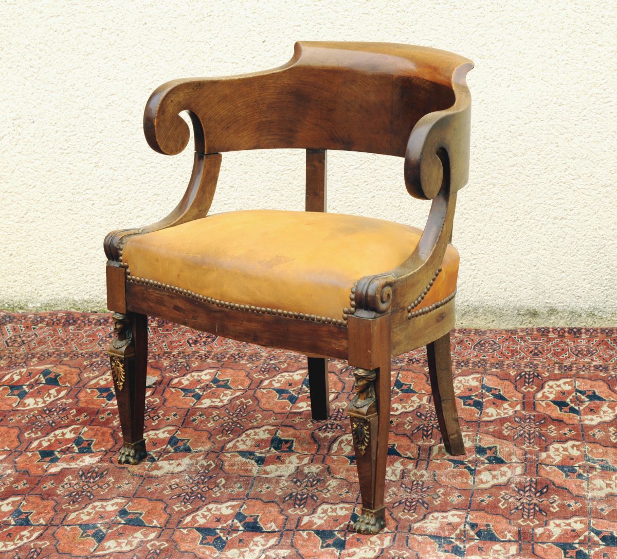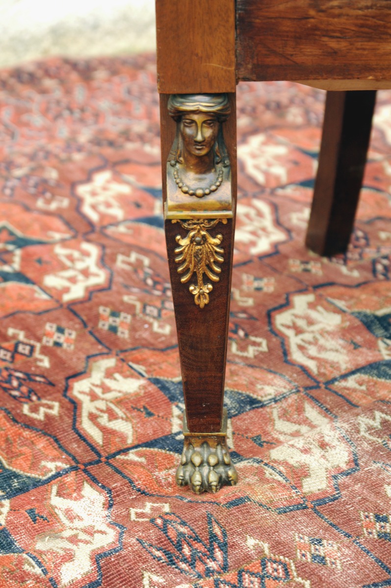 FAUTEUIL DE BUREAU en acajou et placage d'acajou flammé. Dossier enveloppant avec accotoirs se terminant en crosse. Pieds antérieurs en gaîne. Pieds postérieurs en sabre. Ornementation de bronzes rapportés : bustes de caryatides, palmettes et sabots en forme de pattes de lion. Restauration. XIXème. Haut. 75, Larg. 62,5 Prof. 50 cm. (usures)