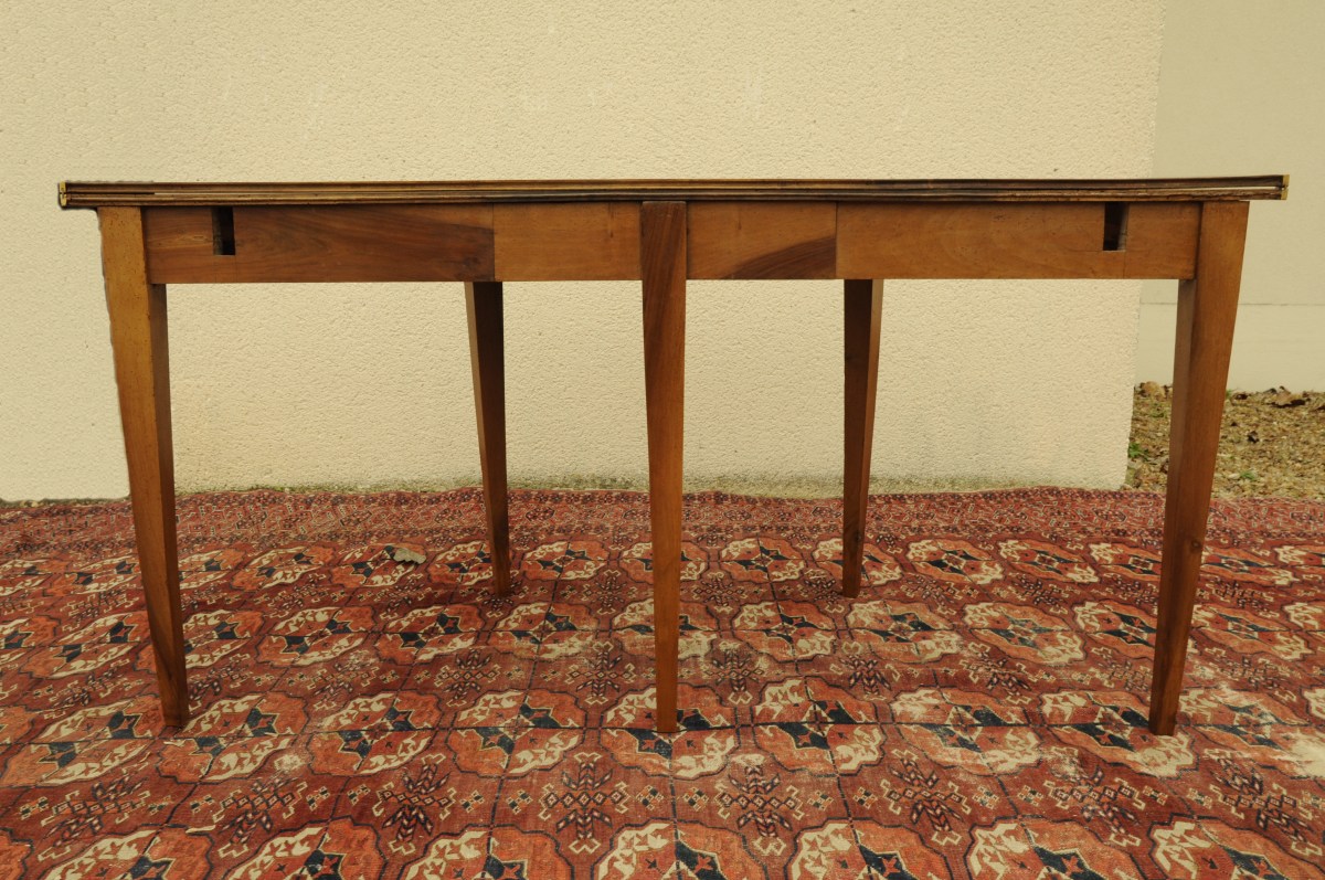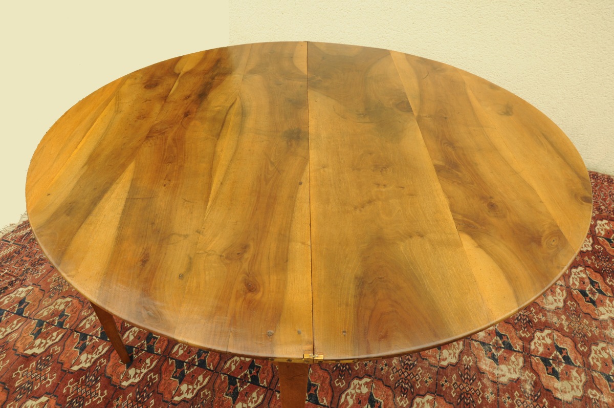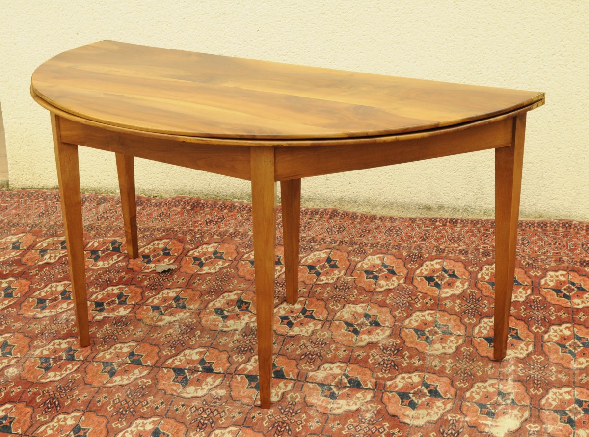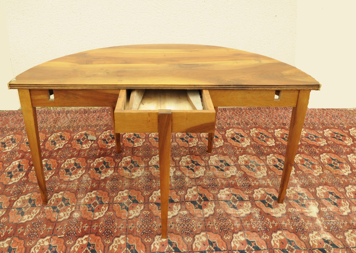 TABLE DEMI-LUNE en noyer blond à plateau dépliant. Pieds en gaine, dont un se retractant. XIXème.