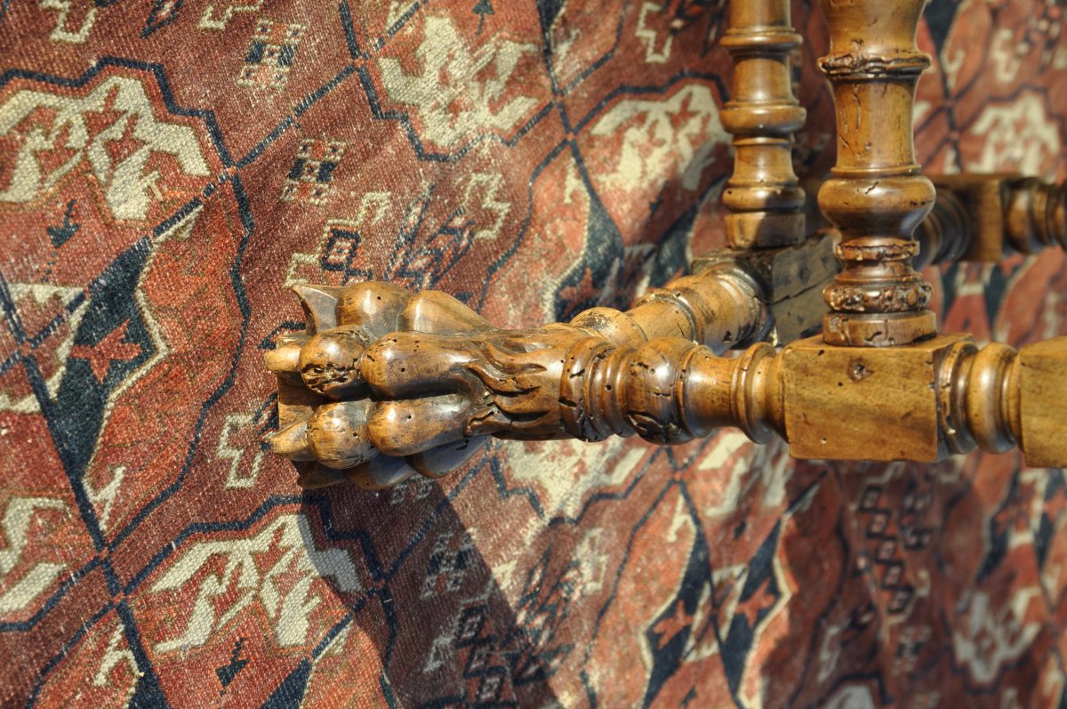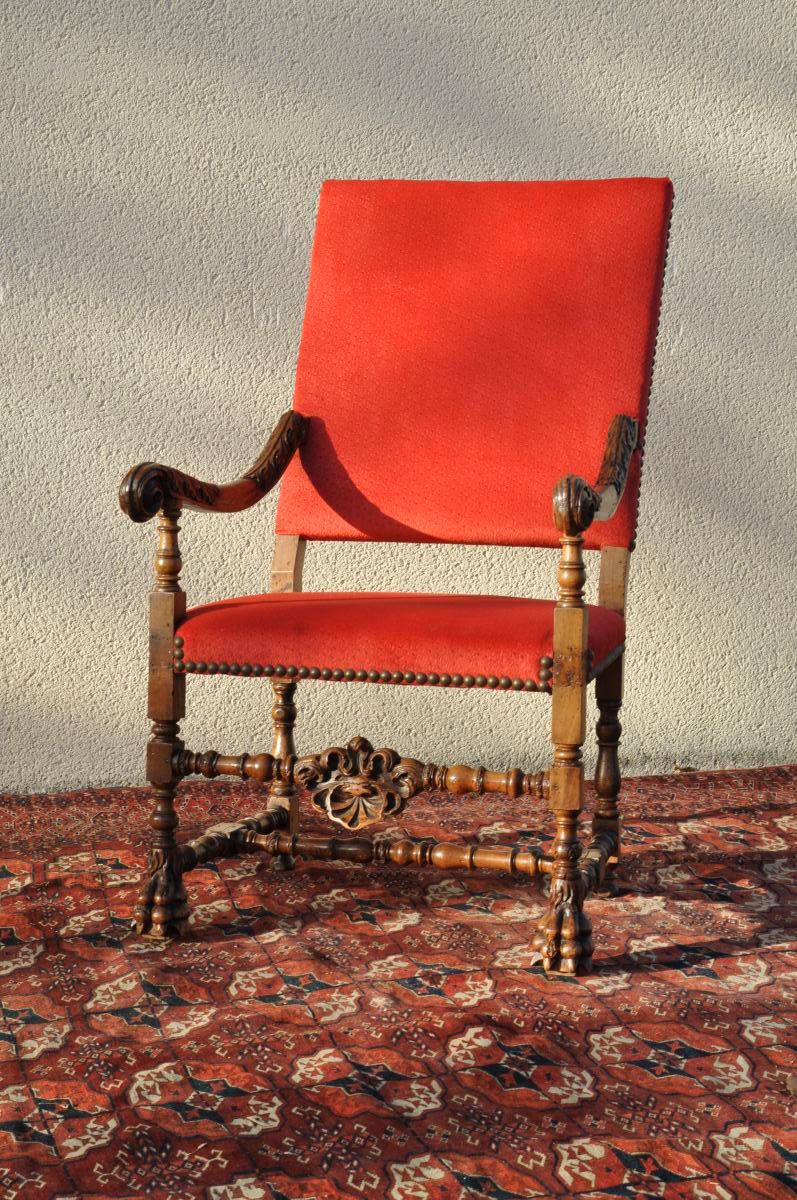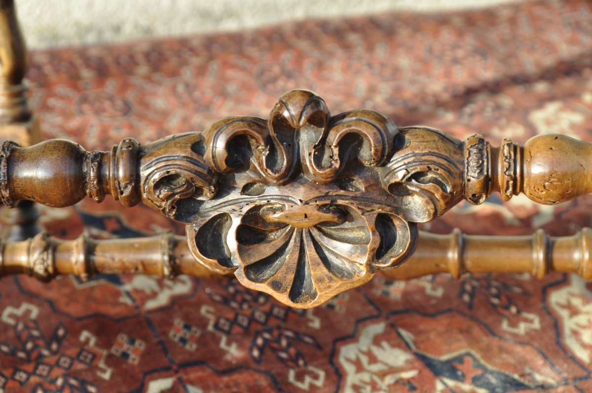 FAUTEUIL à haut dossier incliné en noyer mouluré et sculpté, les accotoirs à décor de feuilles d'acanthes, les pieds tournés en balustre réunis par une entretoise en "H". Les pieds avant se terminent en patte de lion, la traverse présente une grande coquille sculptée. Gênois, traces d'argenture. Travail italien ancien.