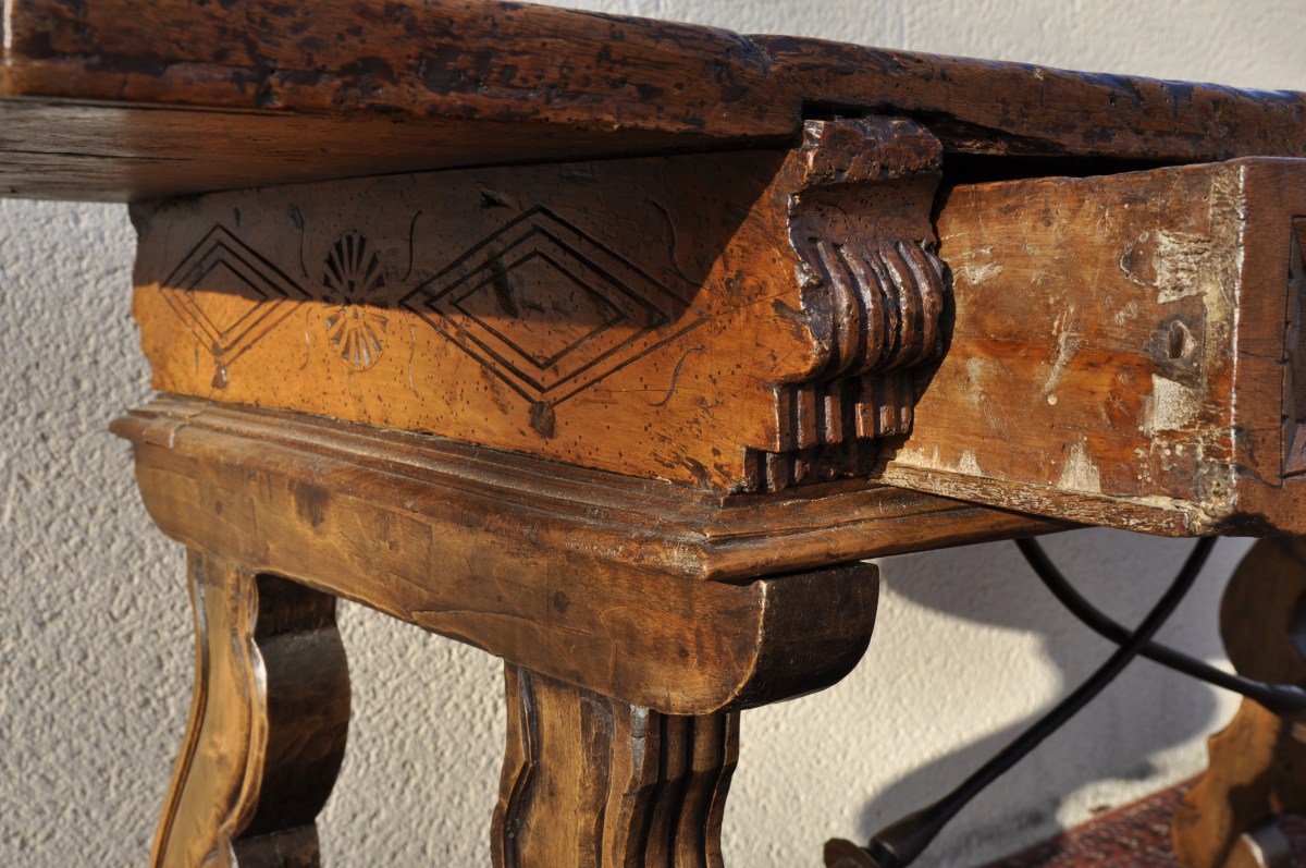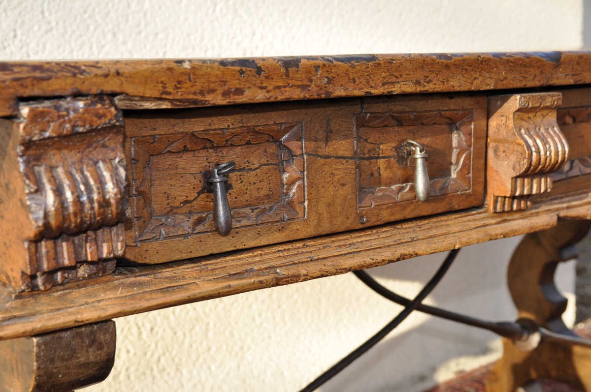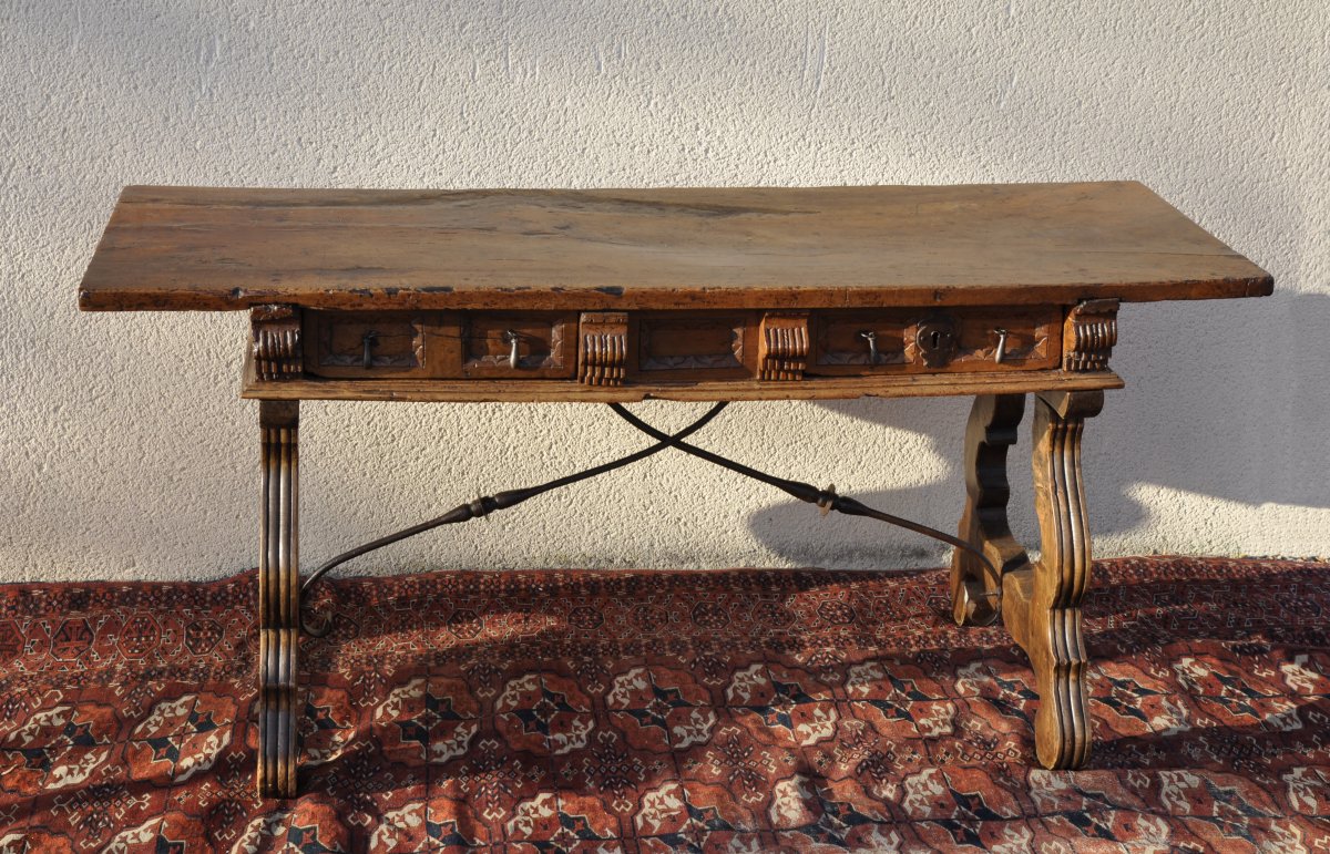 TABLE de forme rectangulaire en bois naturel mouluré et sculpté de motifs losangés. Ouvre à deux tiroirs en ceinture et repose sur deux montants obliques chantournés reliés par une traverse de même découpe. Une entretoise en X en fer forgé les rattache au plateau. Travail dans le style espagnol XVIIème. Haut. 78,6, Long. 164,2, Larg. 56,7 cm.