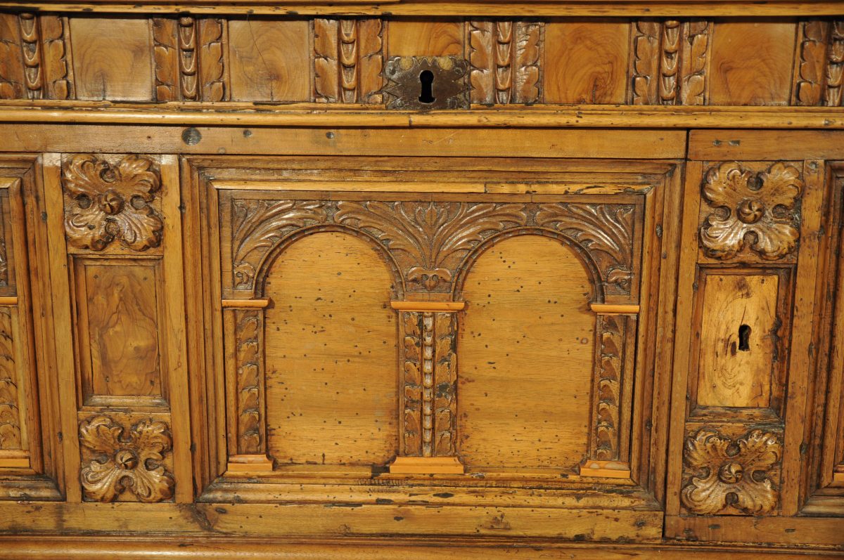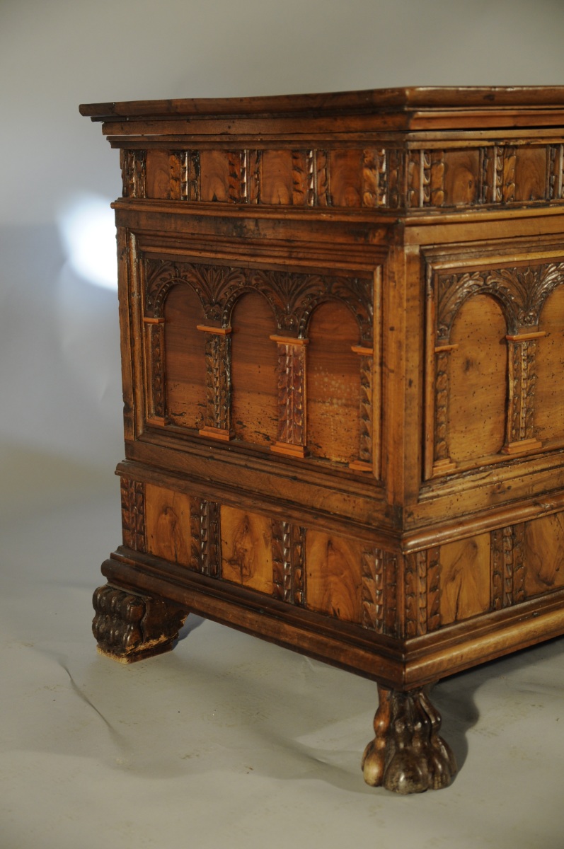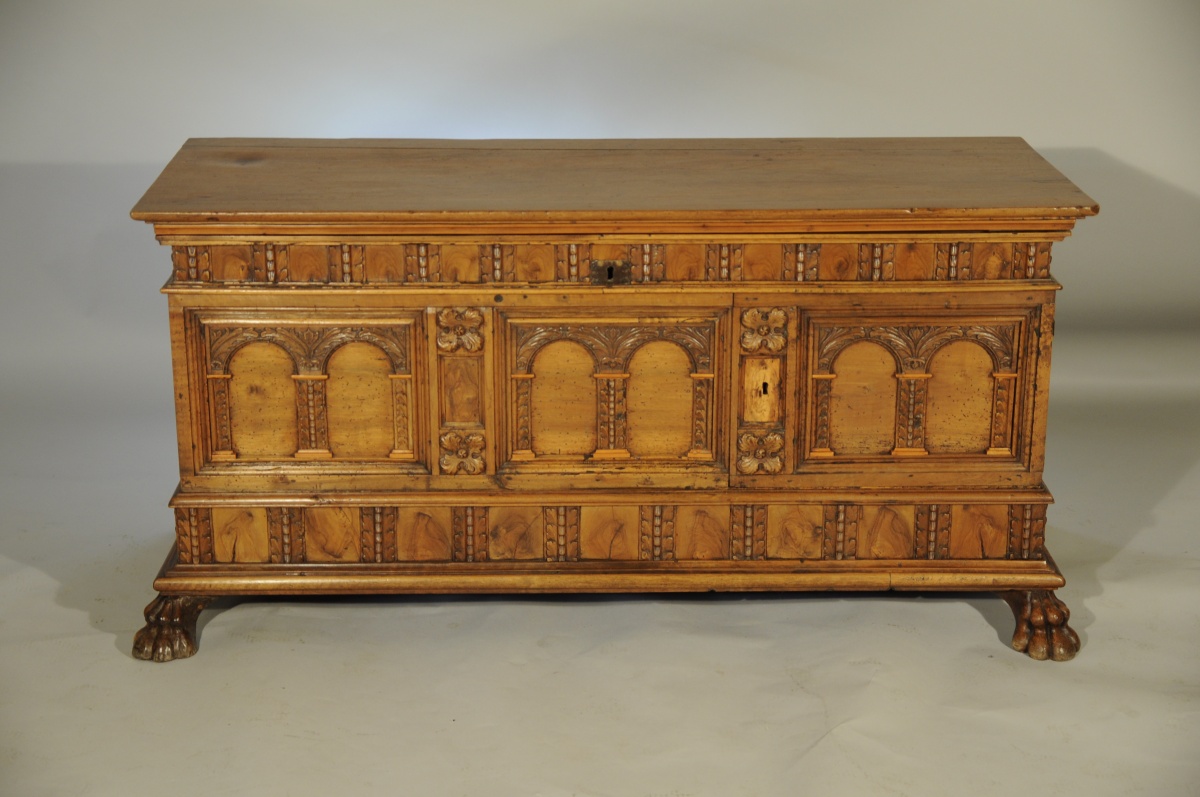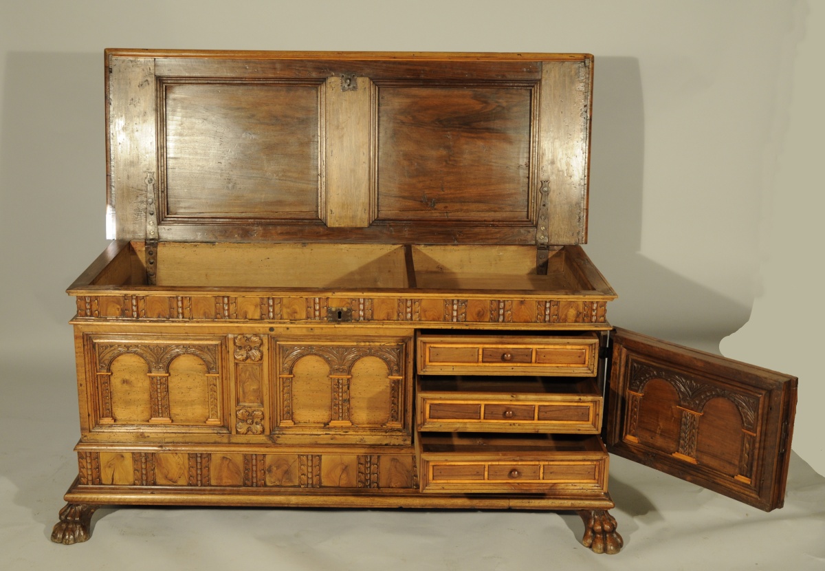 COFFRE DIT « CASSONNE » en noyer mouluré et sculpté, à décor de fenestrages, feuillages et fleurettes. Il ouvre par un vantail découvrant trois tiroirs et une niche. Pieds en forme de pattes de lion, pieds postérieurs. Travail Espagnol, XVIème. Haut. 69, Larg. 138, Prof. 54 cm. (trous de vers, usures, restaurations)