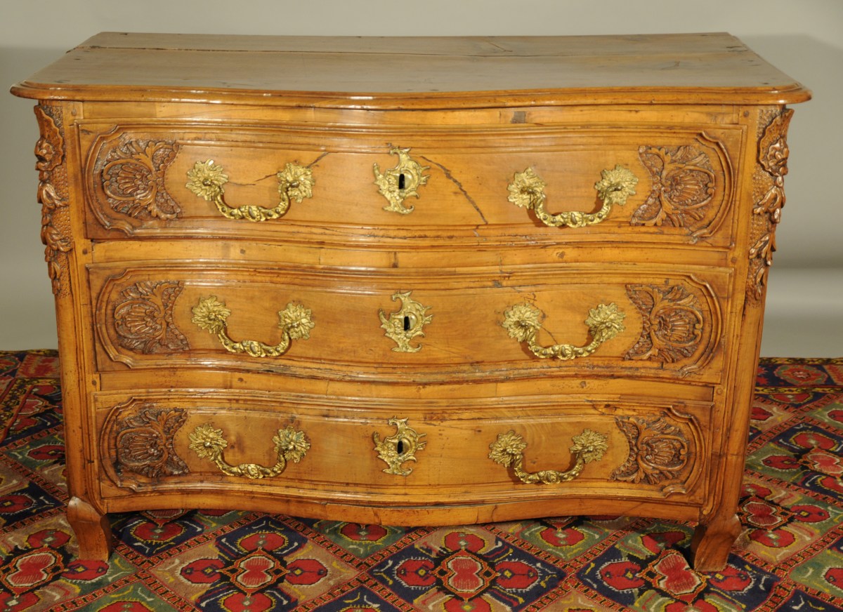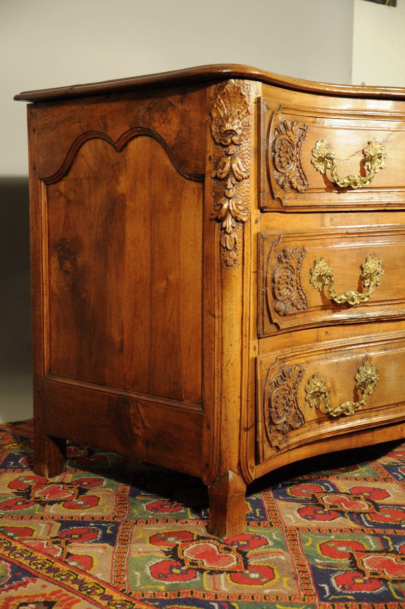 COMMODE en noyer mouluré et sculpté. Façade galbée ouvrant par trois tiroirs à décor d'agraphes, rinceaux, perles et coquilles. Pieds cambrés. Garnitures en bronze doré de style rocaille telles que, poignées de tirage et entrées de serrures.