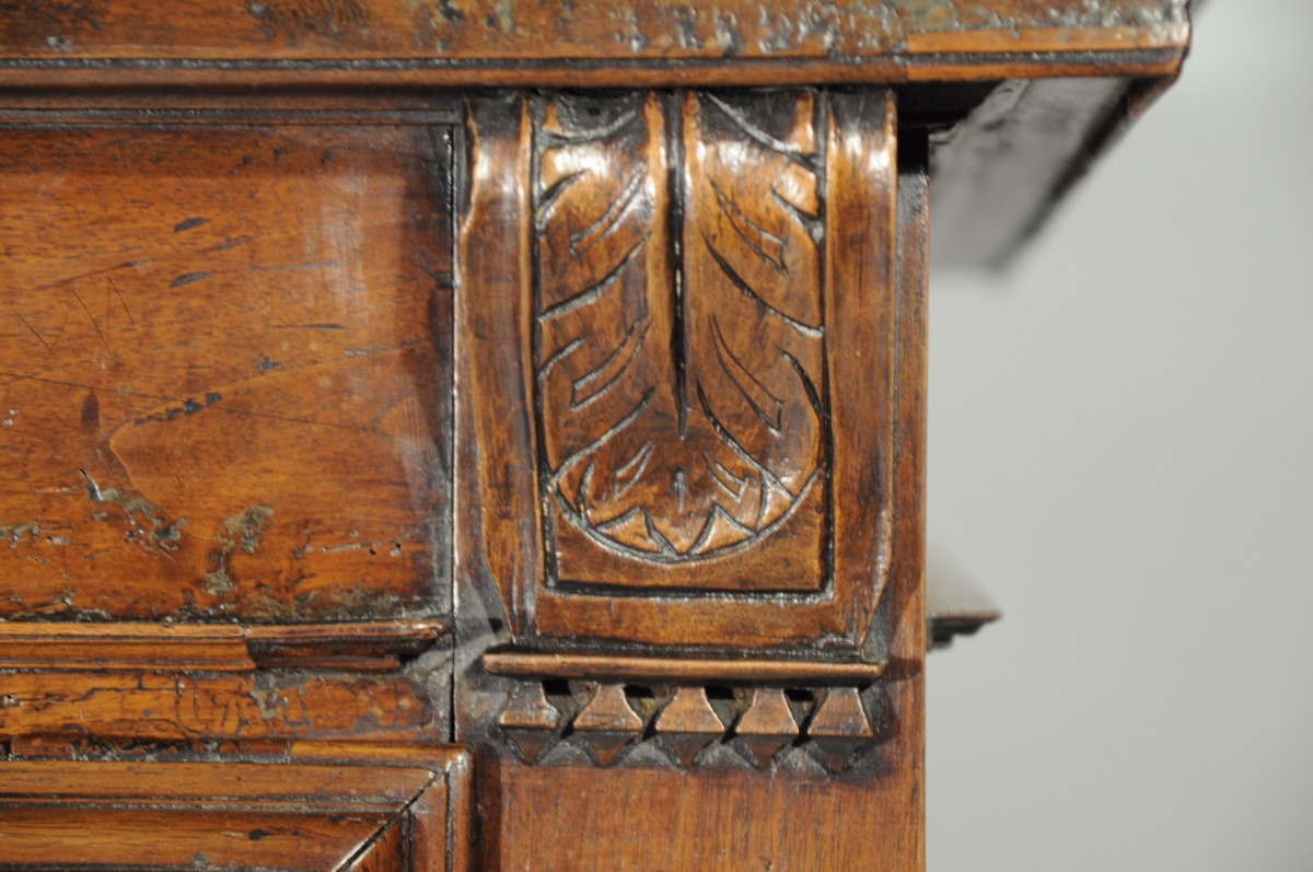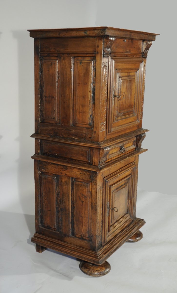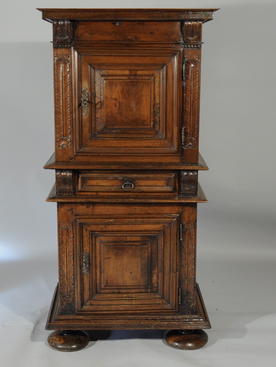 ARMOIRE HAUTE à deux corps en noyer teinté, mouluré et sculpté. Elle ouvre par deux vantaux et un tiroir en ceinture. Corniches soutenues par des consoles à volutes à décor de feuilles d'eau et de gouttes. Feuilles d'eau sur les montants. Pieds en boules aplaties. Travail régional ancien, probablement bourguignon. XVIème-XVIIème. Haut. 156, Larg. 74, Prof. 75 cm.