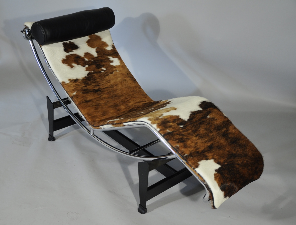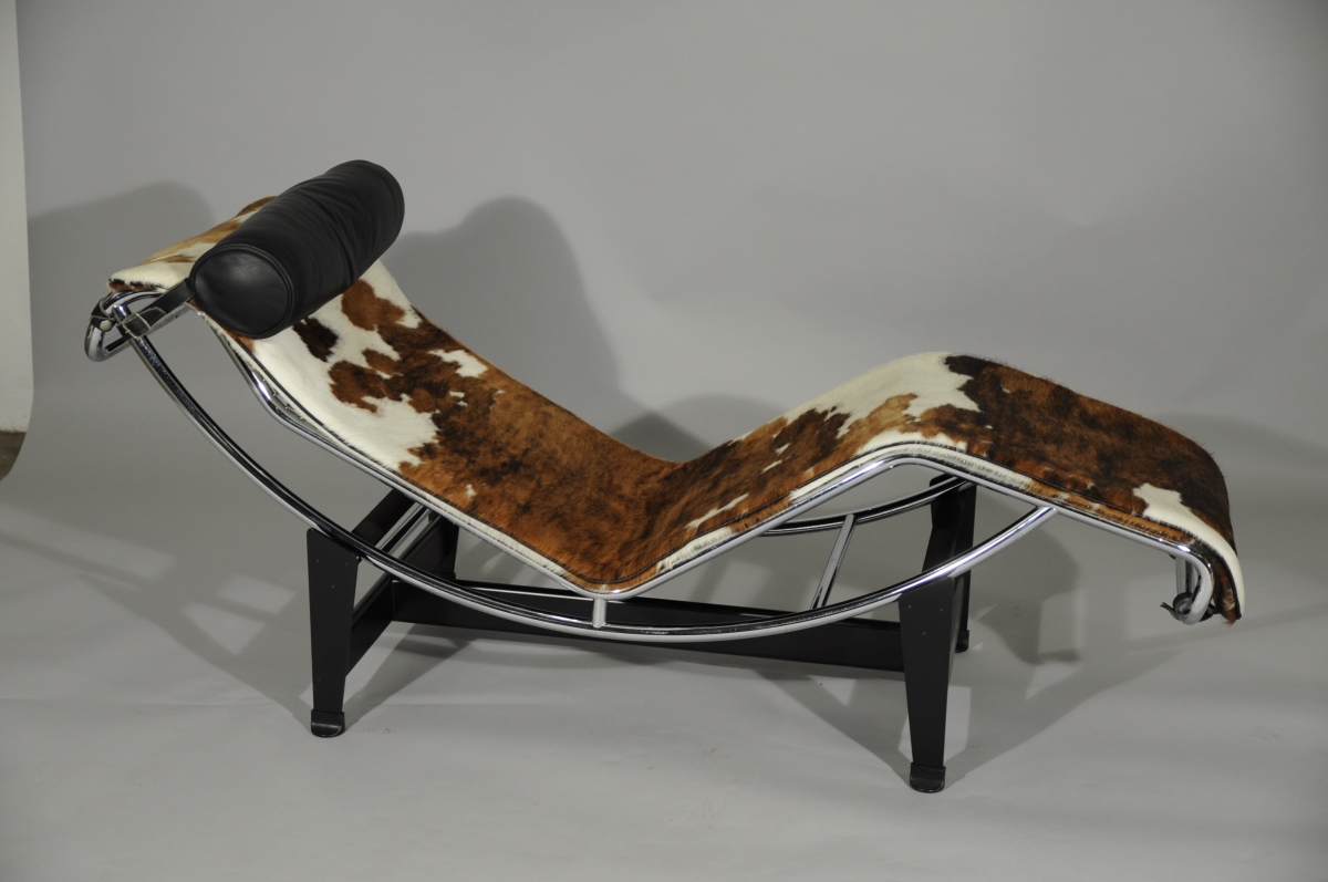Chaise longue, modèle LC4 (1928), à structure en métal laqué noir, berceau en tube d'acier nickelé, recouvert d'une peau de vache et traversin en cuir noir. Justificatif d'édition numérotée 67493, édition années 1965-1978. Haut. 69, Long. 168, Larg. 49 cm.