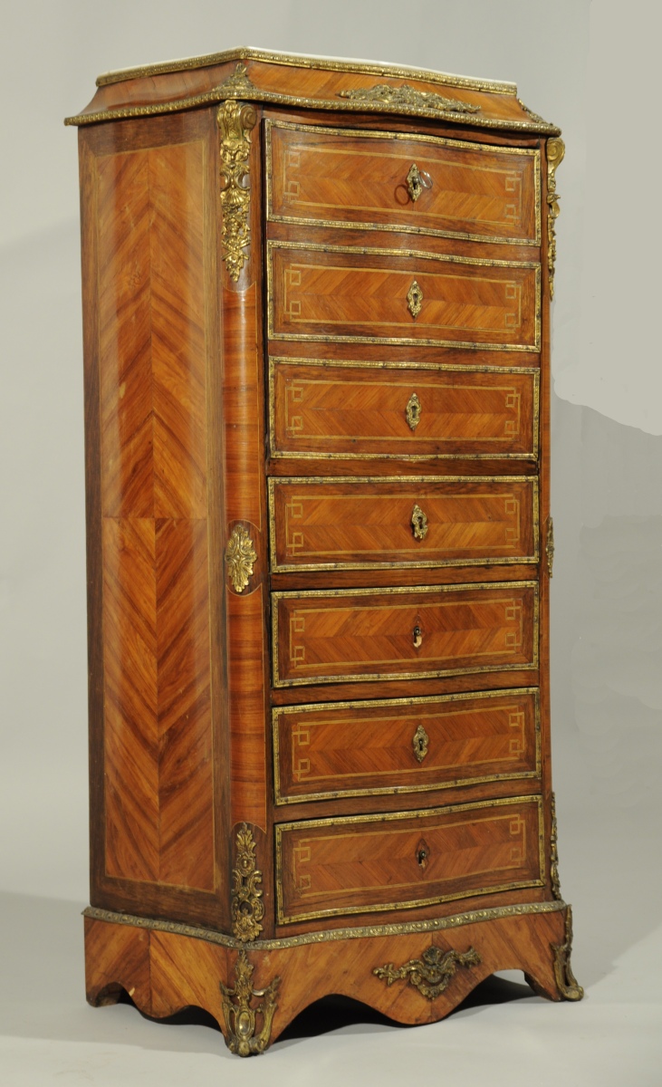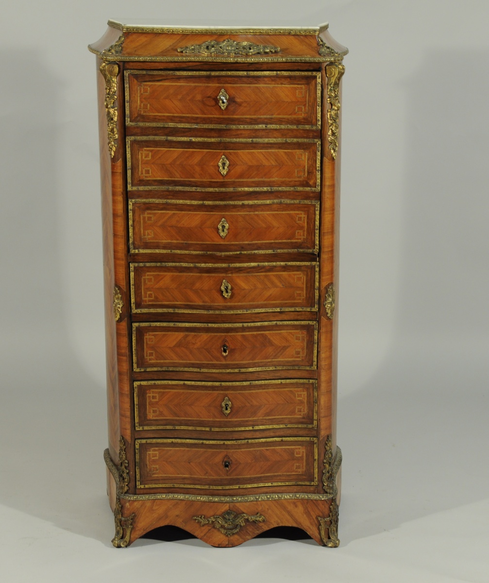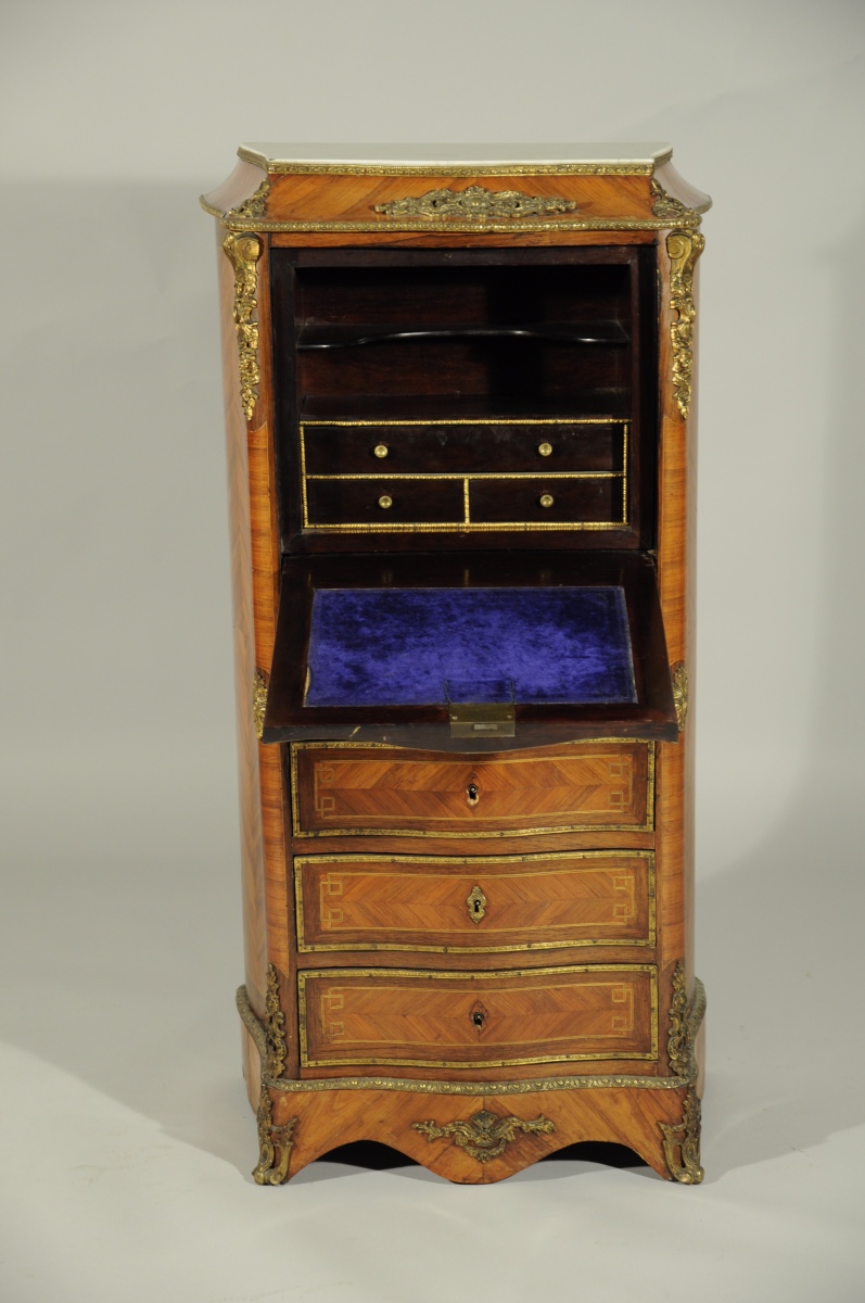 SECRÉTAIRE à côtés galbés en bois de placage. Simulant un semainier, il ouvre à un abattant, découvrant une tablette et trois tiroirs, et quatre tiroirs. Traverse mouvementée et pieds cambrés. Décor de frisage et filets d'encadrements. Garnitures de bronze doré telles que chutes, filets, entrées de serrures et sabots. Dessus marbre blanc veiné encastré. Style Louis XV, Napoléon III. Haut. 125, Larg. 55, Prof. 33 cm. (usures, petits manques)