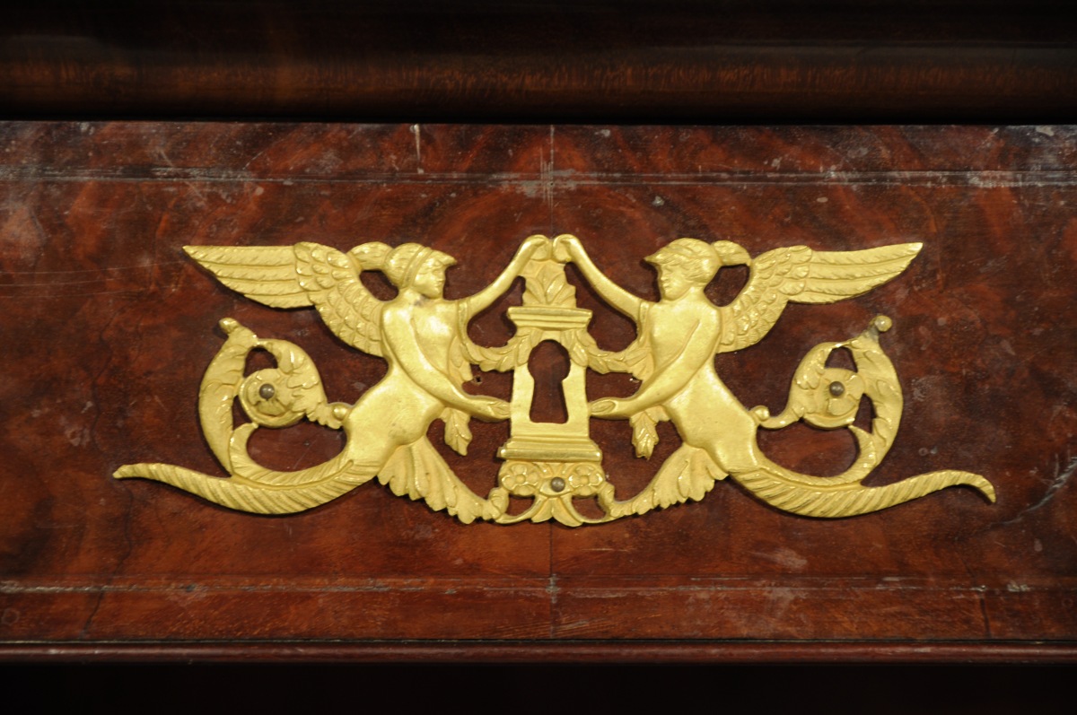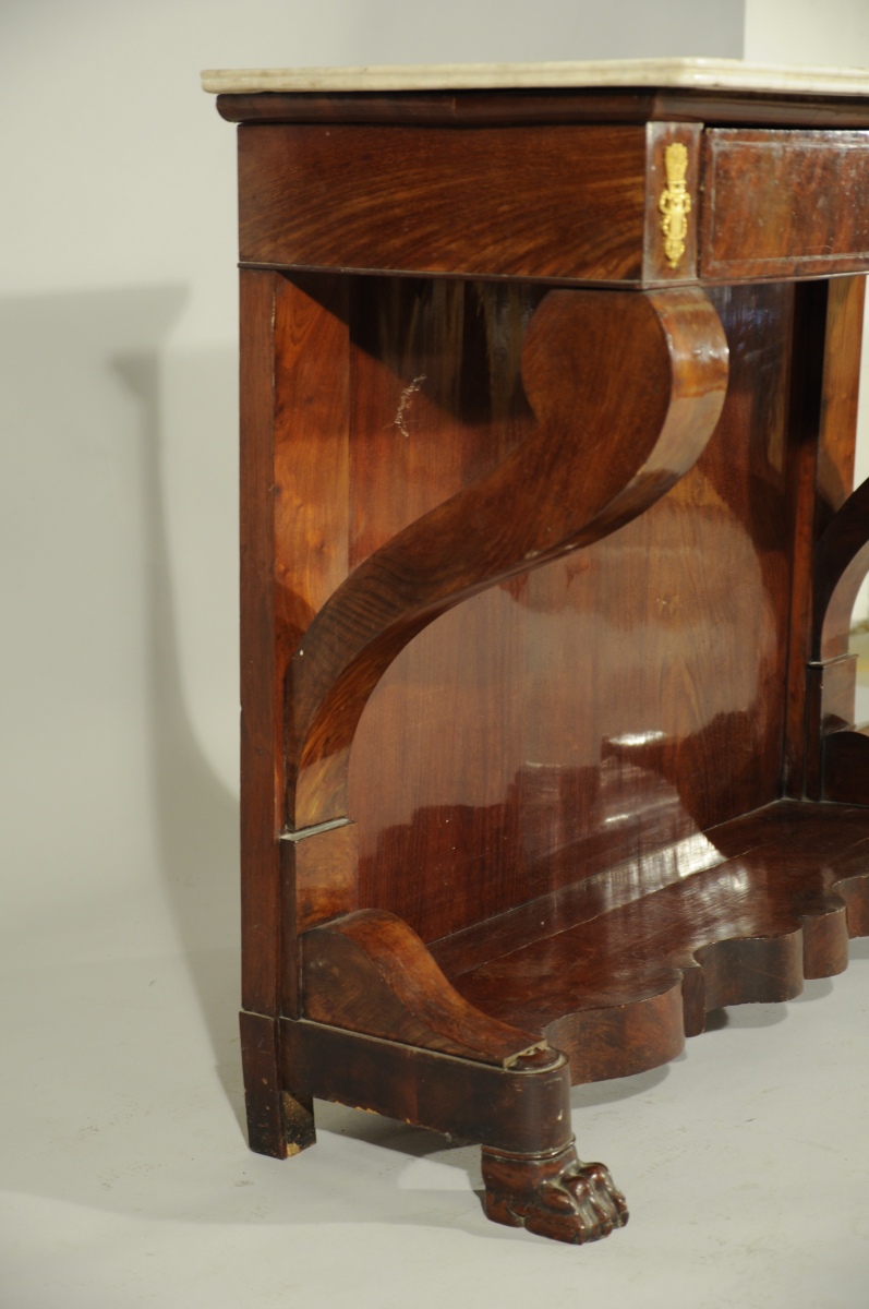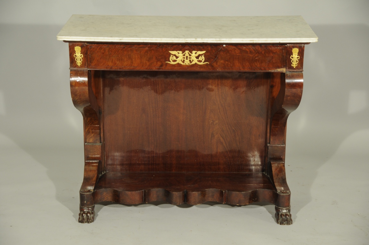 CONSOLE en acajou et placage d'acajou. Elle ouvre par un tiroir en ceinture. Pieds en consoles se terminant en pattes de lion réunis par une tablette d'entrejambe. Dessus de marbre. Empire. Haut. 88, Larg. 99, Prof. 42 cm. Ornementation de bronze doré sur la ceinture. (petit accident)