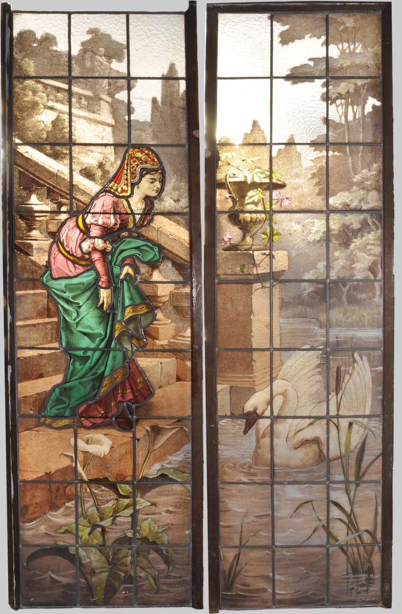 PAIRE DE PANNEAUX EN VITRAIL polychrome de forme rectangulaire représentant, dans un extérieur, une élégante en habits médiévaux descendant les marches d'un embarcadère face à un cygne. Signé Hubert Martineau à Paris. XIXème. Haut. 185,5, Larg. 47 cm.