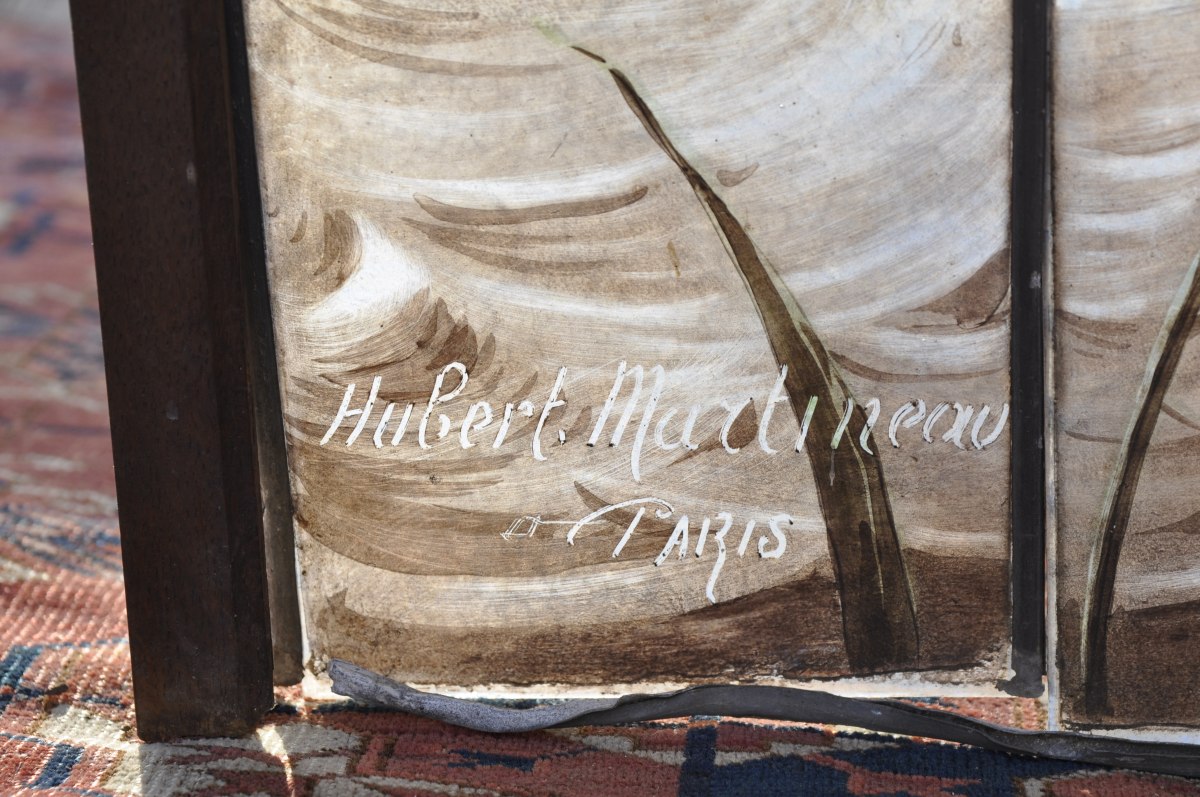 PAIRE DE PANNEAUX EN VITRAIL polychrome de forme rectangulaire représentant, dans un extérieur, un gentilhomme en habits médiévaux voguant sur un lac, debout sur une gondole. Il tend la main. Signé Hubert Martineau à Paris. XIXème. Haut. 185,5, Larg. 47 cm.
