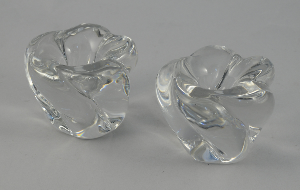 DAUM. PAIRE DE BOUGEOIRS en cristal de forme spirale. Signés Daum Nancy France à la Croix de Lorraine. Années 1970. Haut. 9,2, Larg. 11 cm. (très légères usures)