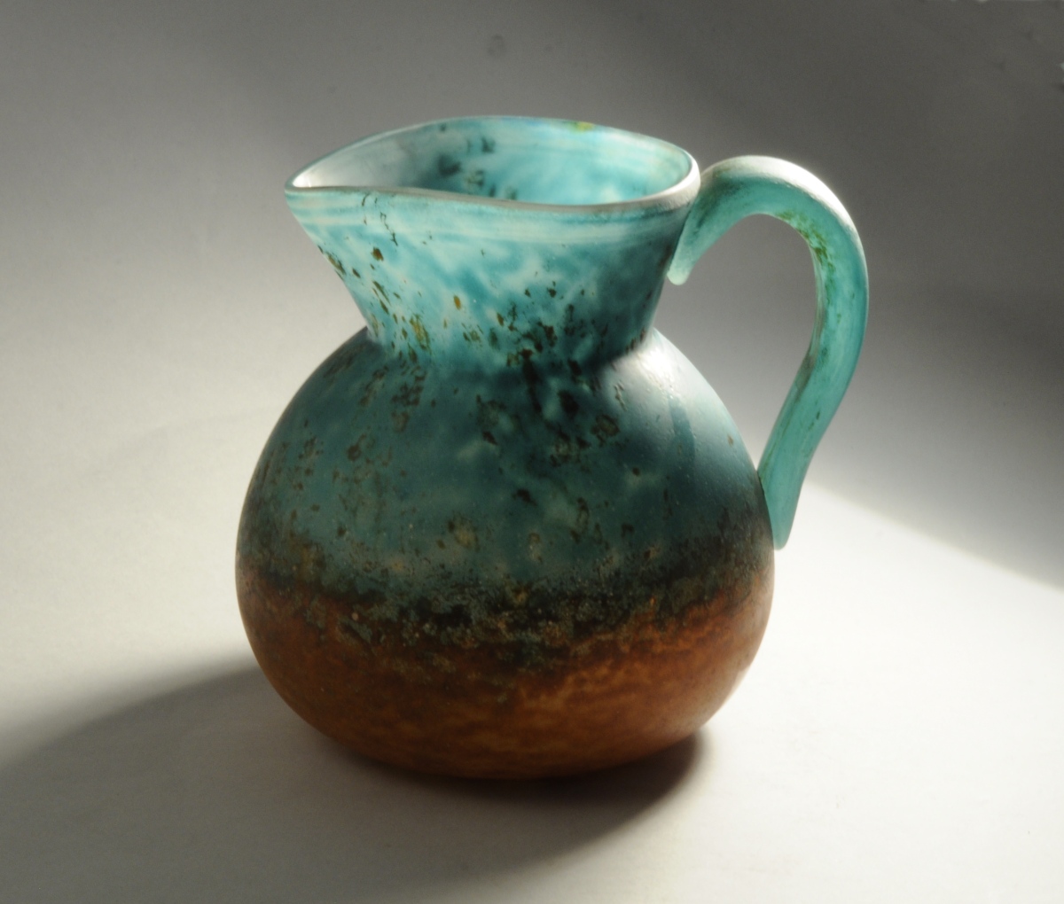 Georges DE FEURE et DAUM. Pichet à large panse en verre opaque vert et orangé, anse appliquée. Signé "G. de Feure". Vers 1920. Haut. 17cm.