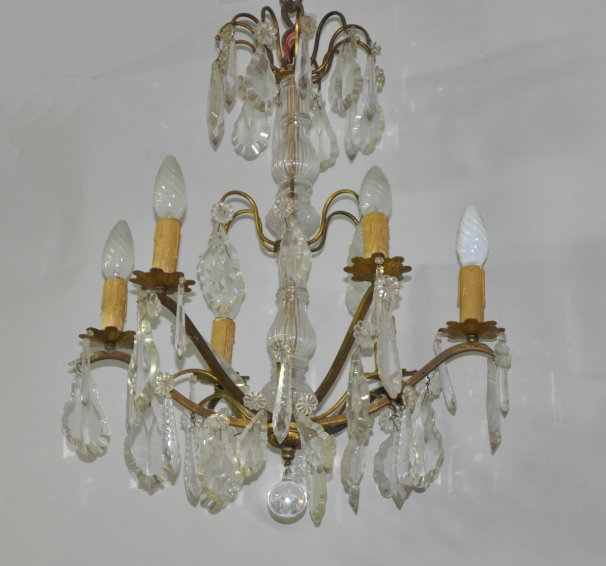 Paire de GIRANDOLES et LUSTRE. Les girandoles à quatre lumières réunies par un fût balustre en bronze doré à motifs de feuilles d'acanthes, ornementation de pampilles de verre sur trois niveaux. Le lustre en laiton à six lumières et pampilles de verre. Électrifiés. Style Louis XVI. Fin du XIXème, début du XXème. Girandoles : Haut. 61,5 cm. Lustre : Haut. 58 cm.