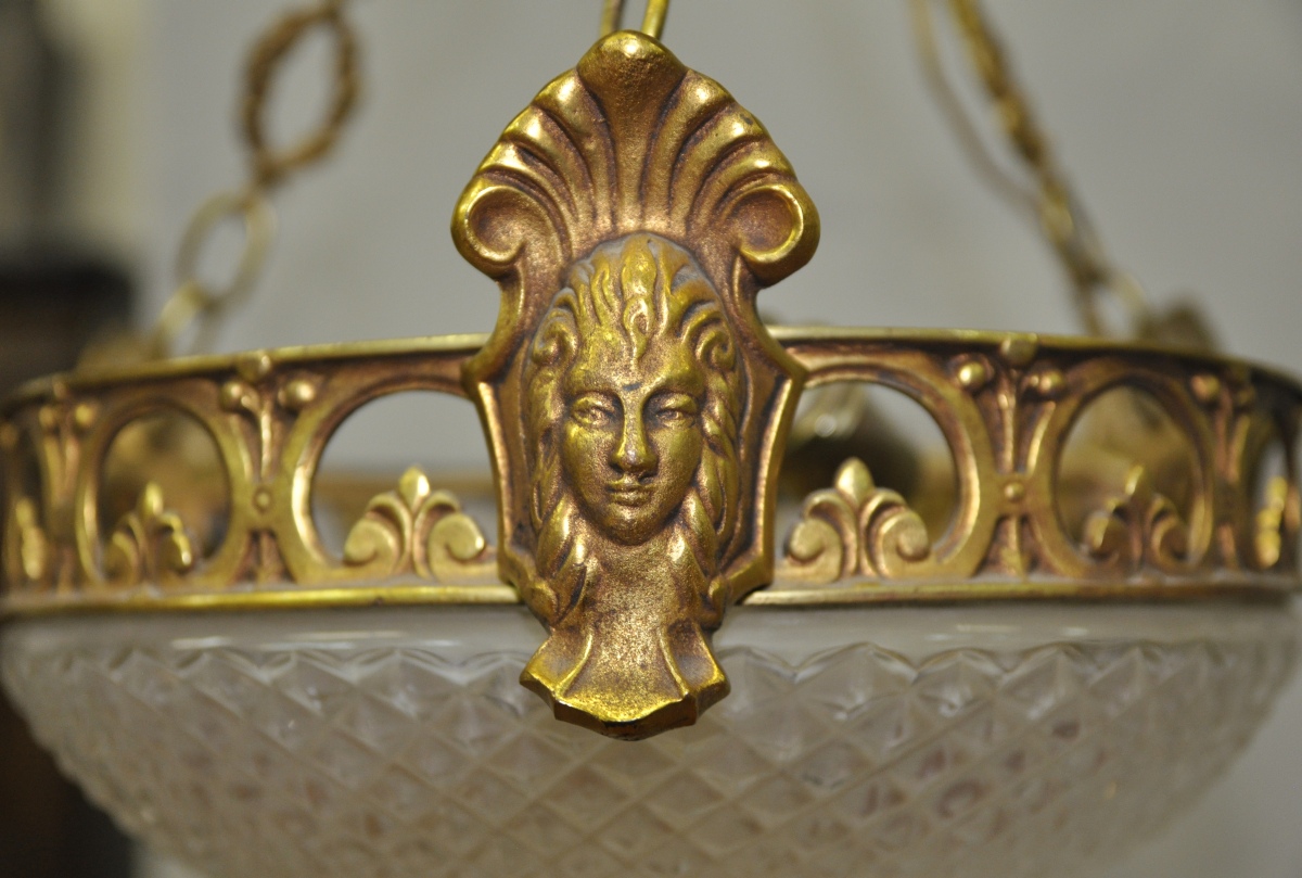 Joint : SUSPENSION circulaire en bronze dorée et verre, constituée d'une coupe couverte taillée de losanges tenue par une monture de frise fleur-de-lysée ajourée et mascarons à la coquille, terminée en son sommet et en sa partie basse par une pome de pin, et suspendue par trois tresses en couronnes de laurier à un plafonnier feuillagé. Électrifiée. Style Empire, XXème. Haut. 41 cm.