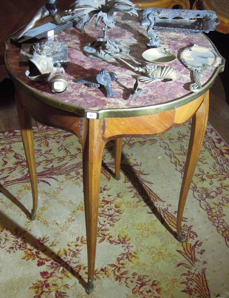 TABLE DE MILIEU de forme circulaire en bois de placage et dessus marbre, style Louis XV (ancien n°28).