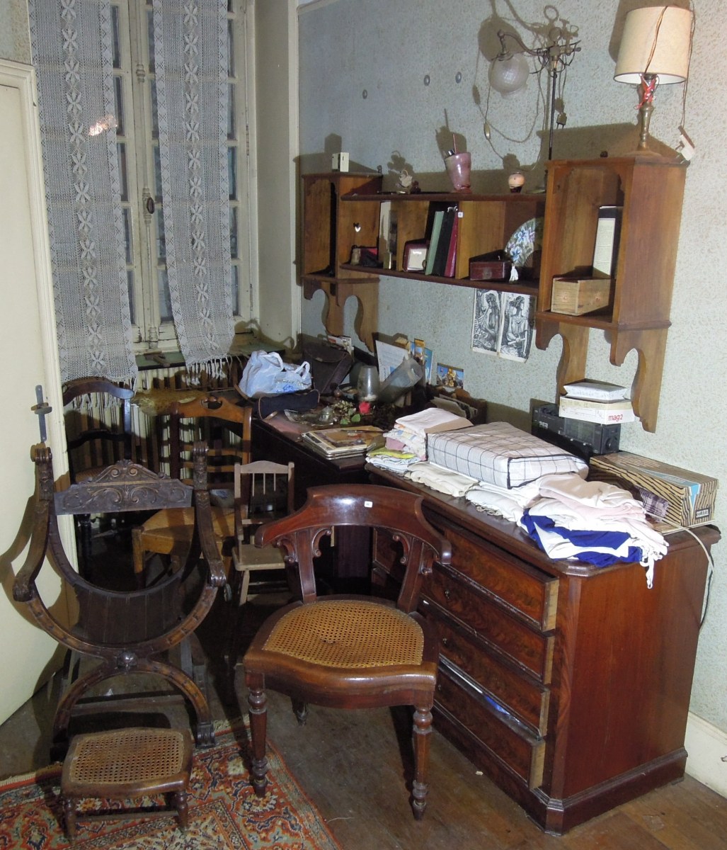Ensemble de BUREAU comprenant : BUREAU À CAISSON et son FAUTEUIL DE BUREAU canné, COMMODE, ÉTAGÈRE MURALE, FAUTEUIL DAGOBERT, deux CHAISES, TABOURET DE PIED cannés, CHAISE HAUTE DE POUPEE, LAMPES diverses et leurs contenus de bibelots (ancien n°36).