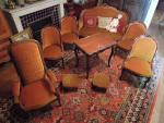 SALON en en noyer teinté, Louis-Philippe, comprenant un CANAPÉ, deux TABOURETS DE PIEDS et quatre chaises garnies de velours jaune (ancien n°43).