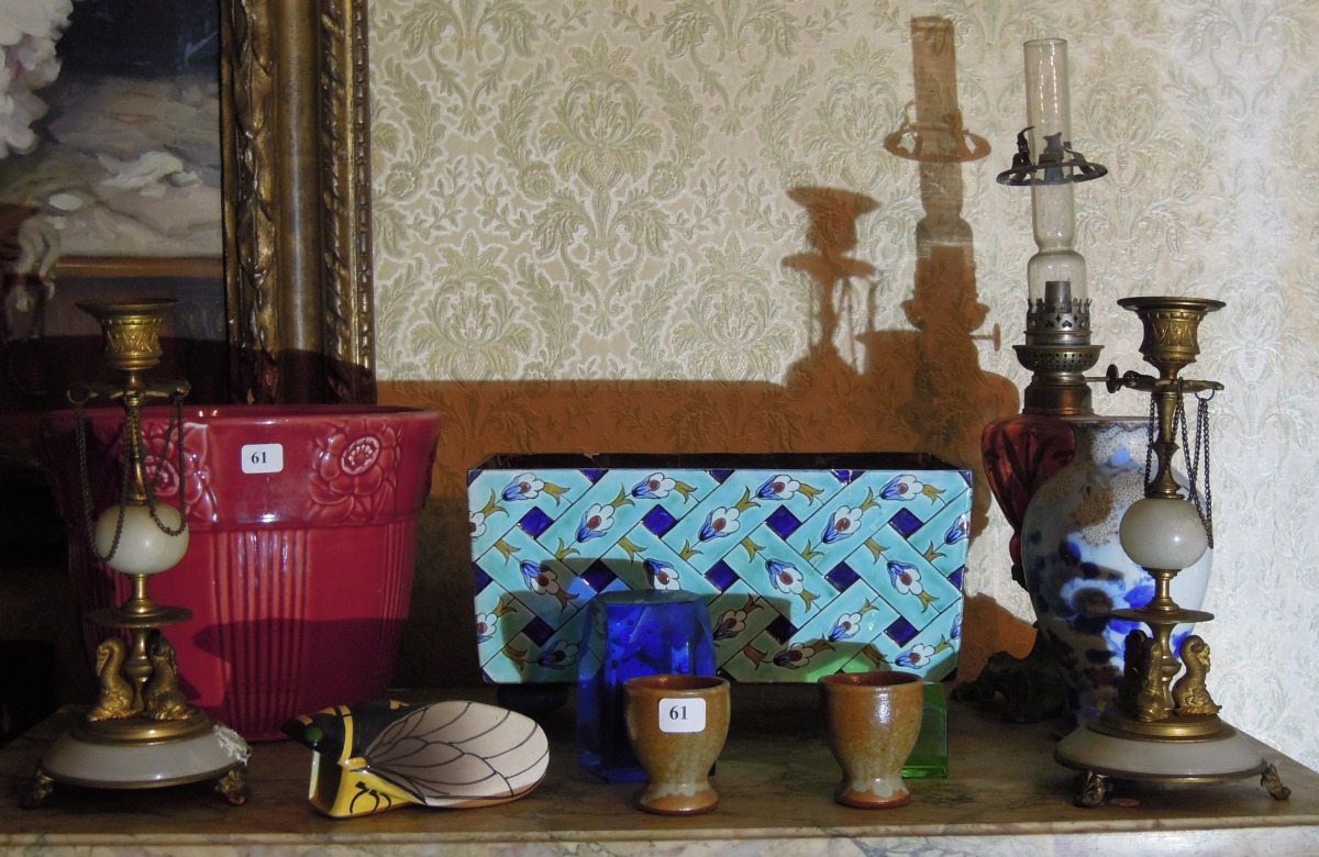 Lot de BIBELOT SUR LE SECRÉTAIRE, dont : paire de FLAMBEAUX, LAMPE À HUILE, VASES, COQUETIER, CACHE-POT, JARDINIERE