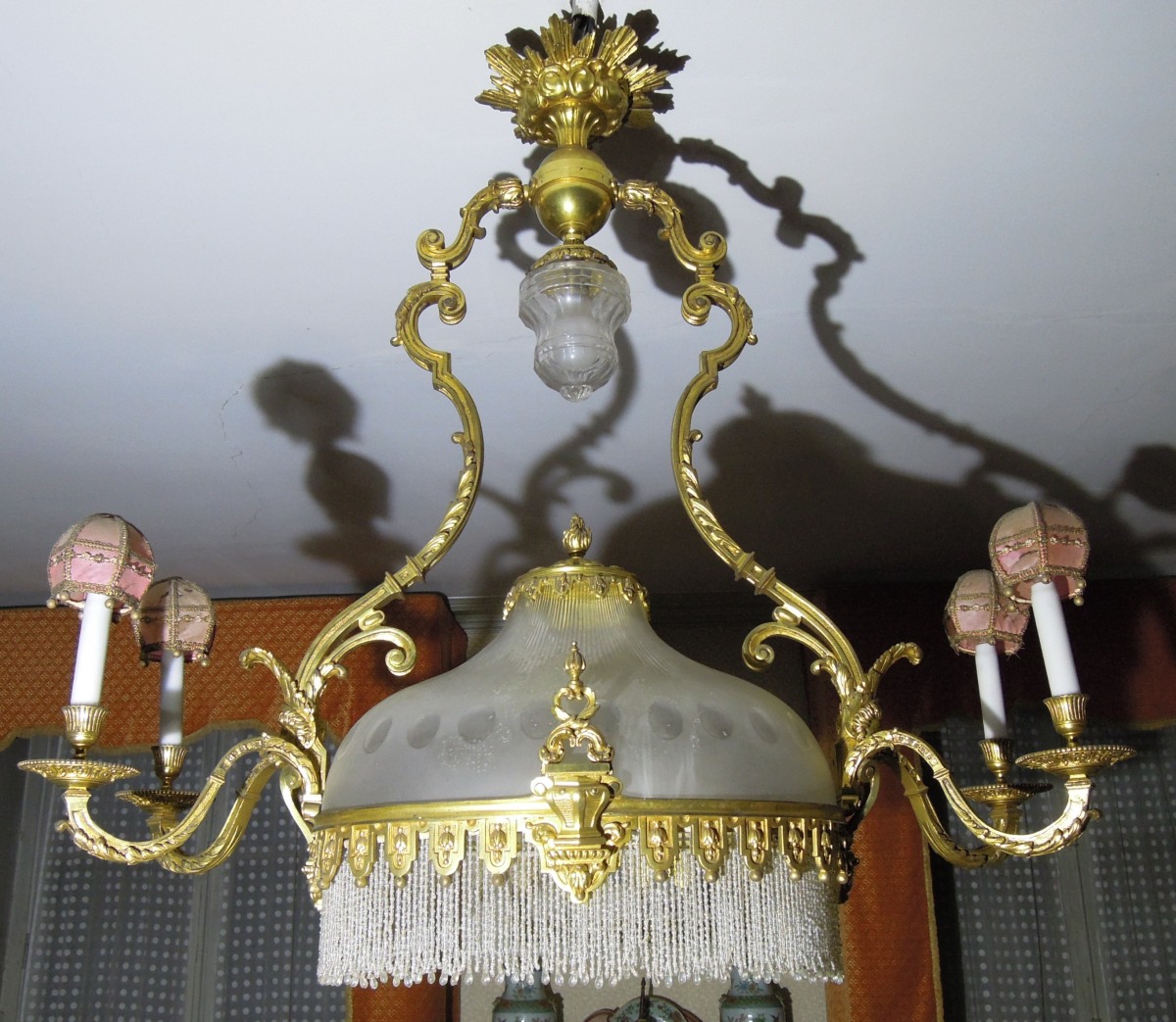 LUSTRE en métal doré et pendeloques à quatre lumières et un globe (ancien n°89).