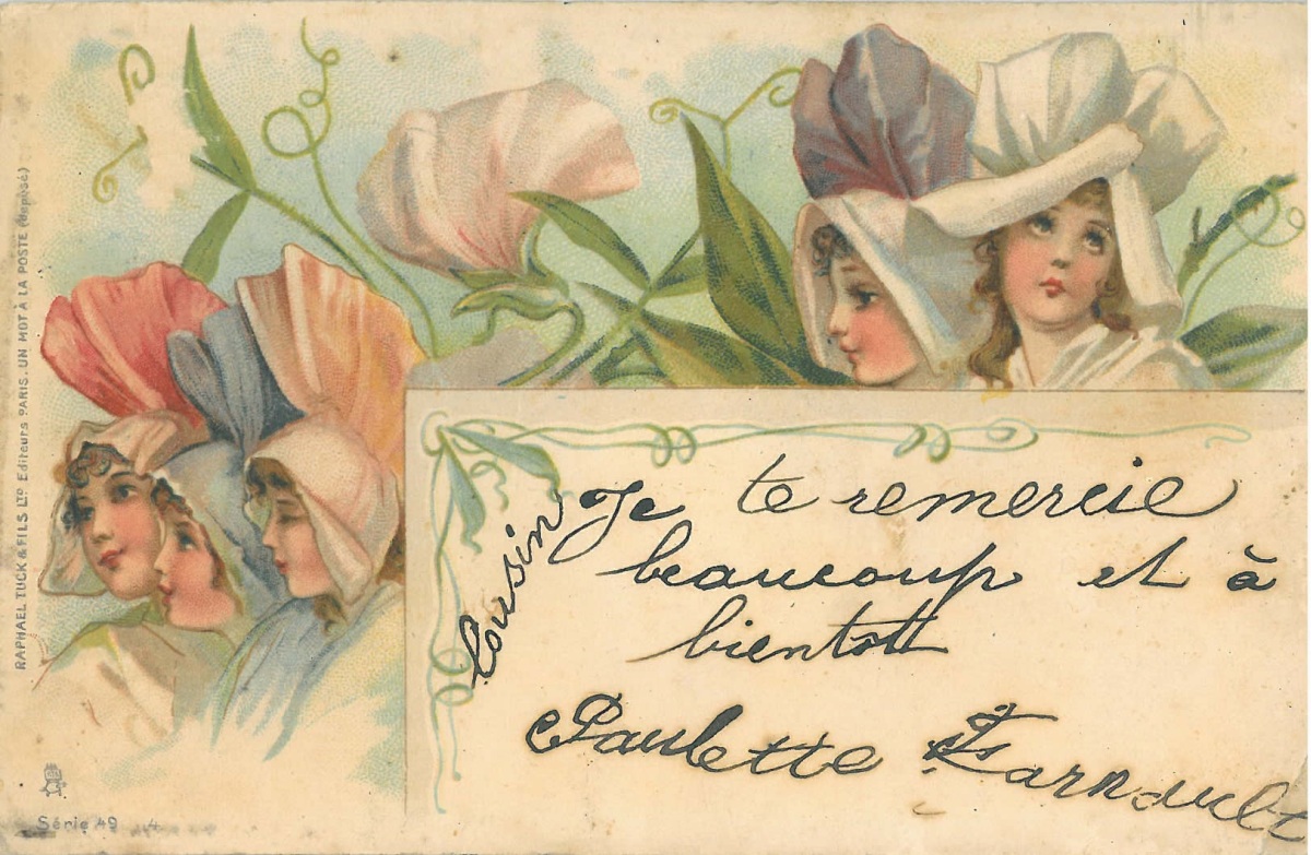 -Une en couleur illustrée de cinq jeunes filles chapeautées dans un environnement de fleurs et feuillages. Écrite recto et verso. Marque "Raphaël Tuck & Fils Ltd. Editeurs Paris. Un mot à La Poste (déposé) / Série 49 / 4". Timbre de 10 centimes et cachet de 1904.