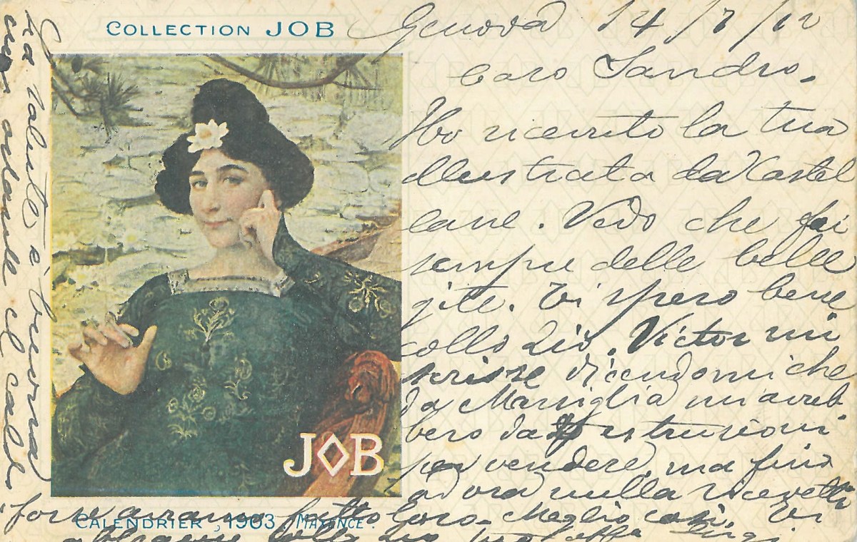 -Une présentant le portrait d'une femme en couleur. Marque "Collection JOB / Calendrier, 1903, Maxence" Ecrite recto et verso, timbre italien avec cachet de 1912.
