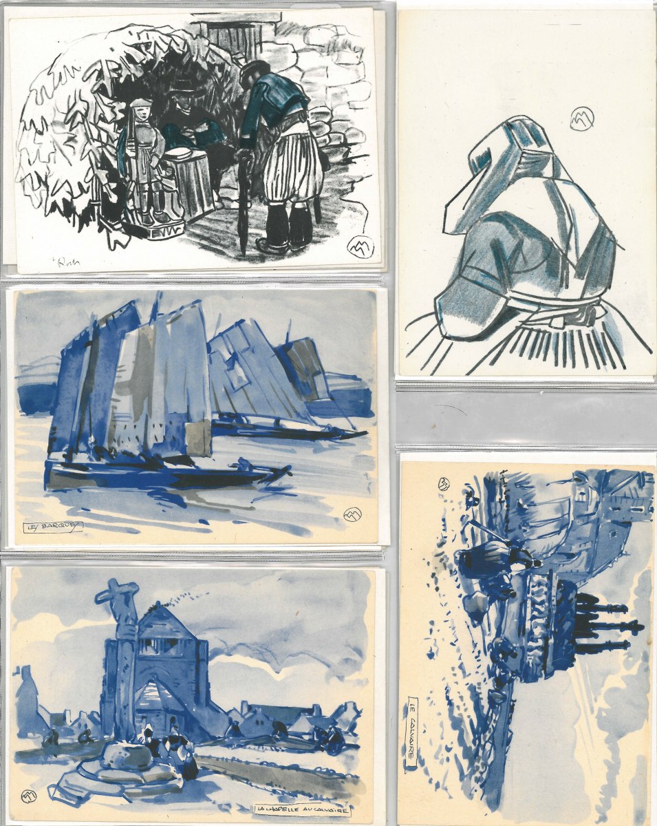 Mathurin MÉHEUT (1882-1956) (d'après). SIX CARTES POSTALES originales de la série "Bretagne Bleue" (Rivage, La Chapelle, Le Sinagot, Le Barquey, La Chapelle au Calvaire et Le Calvaire). Circa 1946.