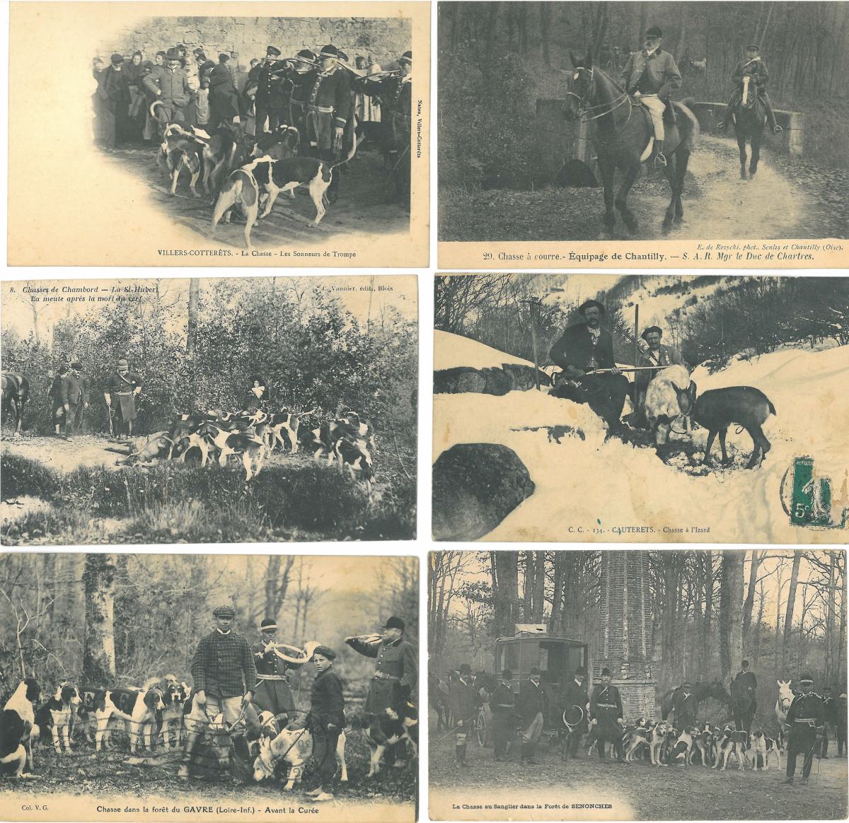 HUIT CARTES POSTALES sur le thème de la CHASSE comprenant : "Chasses de Chambord - La St-Hubert. La meute après la mort du cerf"; "La Chasse au Sanglier dans la forêt de Senonches"; "Chasse dans la forêt du Gavre - Avant la Curée"; "Forêt du Gavre - Le Rond-Point un jour de Chasse"; "Cauterets. - Chasse à l'Izard"; "Chasse à courre.- Équipage de Chantilly. - S.A.R. Mgr le Duc de Chartres"; Villers-Cotterêts. - La Chasse - Les Sonneurs de Trompe"; Salon 1910 - Mlle L. Abbéma - "Chasse à tir". Début XXème.