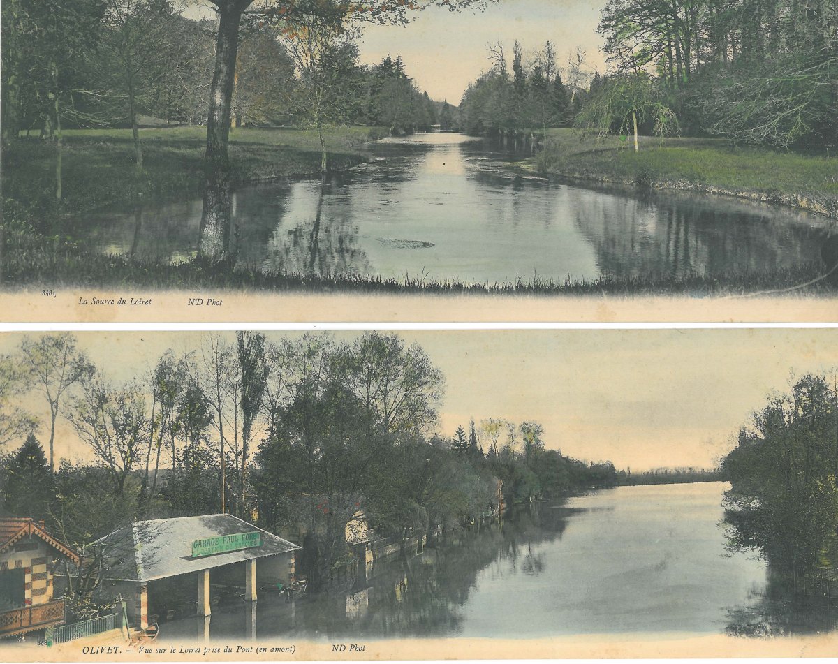 FRANCE. QUATRE CARTES POSTALES COULEUR PANORAMIQUES : "Orléans. - La Place du Martoi"; "Orléans. - Panorama de la Place du Martoi et la Rue de la République"; "Olivet. - Vue sur le Loiret prise du Pont (en amont)" et "La Source du Loiret".