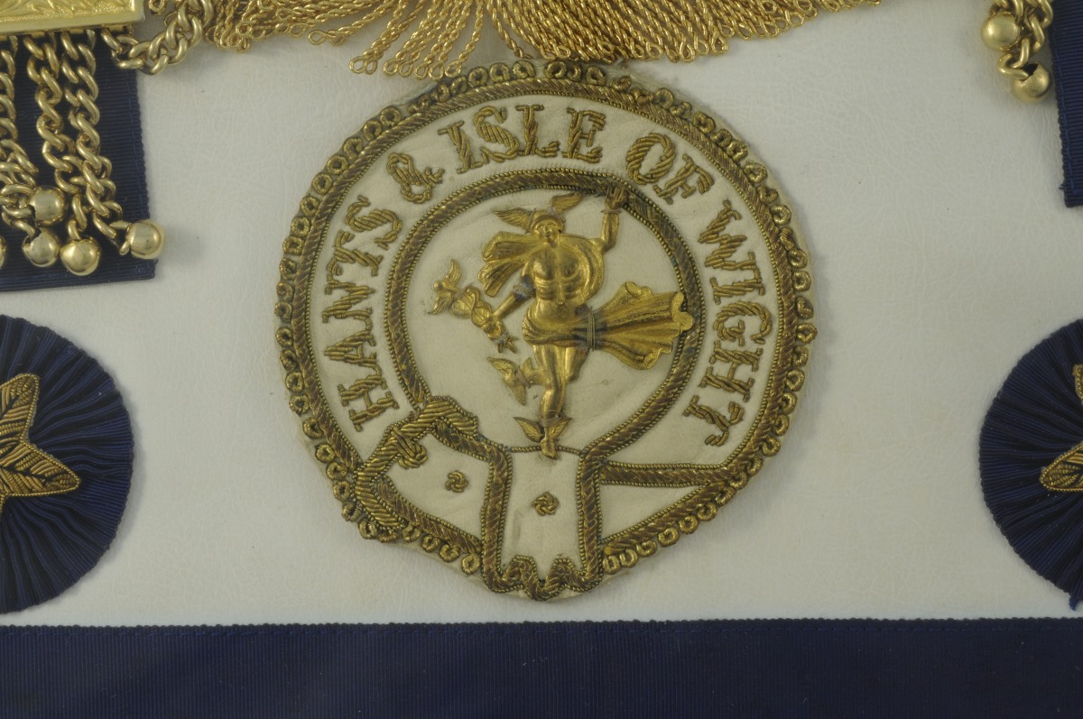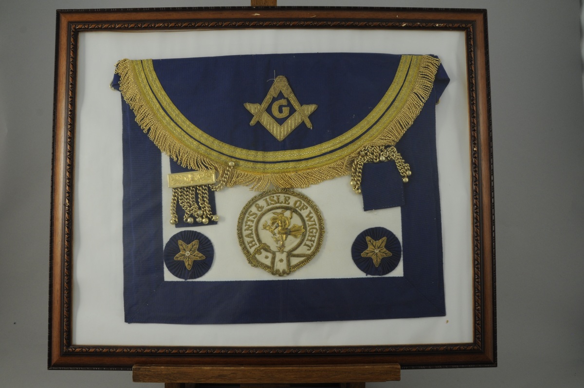 TABLIER écossais en peau teintée blanc, tissu cotelé bleu et fils dorés. Au centre, un médaillon circulaire marqué "Hants & Isle of Wight", orné d'une figure de Mercure en métal doré et deux rosettes en tissu festonné bleu brodées d'une étoile en fil doré. Faux rabat à double galon, compas, équerre et monogramme "G" brodés de fils dorés et deux attaches en métal doré ornées d'un chardon auxquelles sont accrochés sept pendrillons en métal doré terminés par des boules. Cordon de taille. XXème. Long.39 cm, Larg. 32,5 cm.