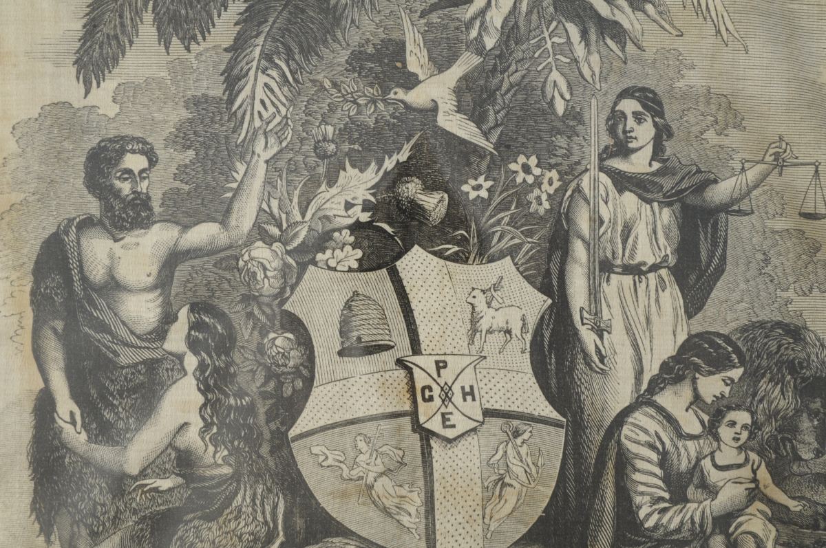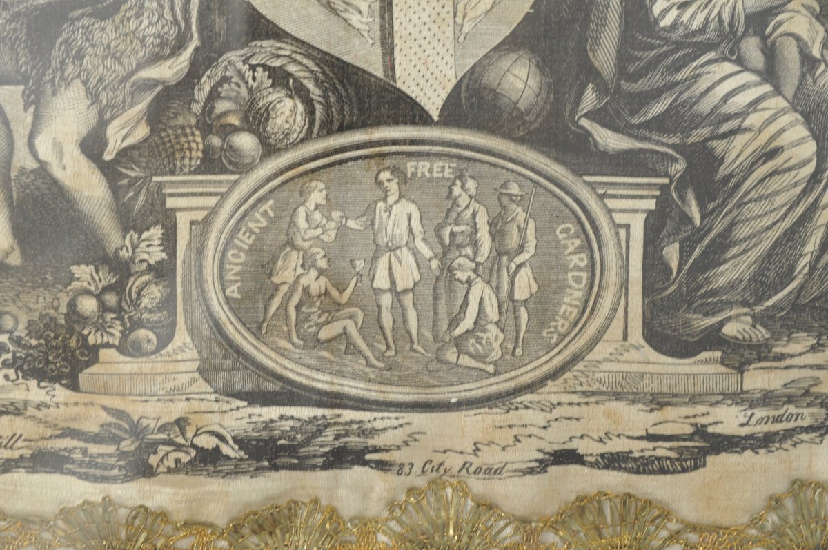 TABLIER de FRANC-JARDINIER en soie crème, galons bleus, verts et roses et fil doré. Sur le plastron, décor imprimé représentant des figures allégoriques dans un jardin exotique avec, au centre, l'emblème de l'ordre anglais des "Ancient Free Gardners". Décor signé "TUTILL / 83 CITY ROAD / LONDON". Les deux coins inférieurs ornés de deux couronnes de lierre et laurier en métal doré centrés d'une ruche et d'un agneau. Fin XIXème, début XXème. Long. 37,3, Larg. 35,3 cm. (légères déchirures)