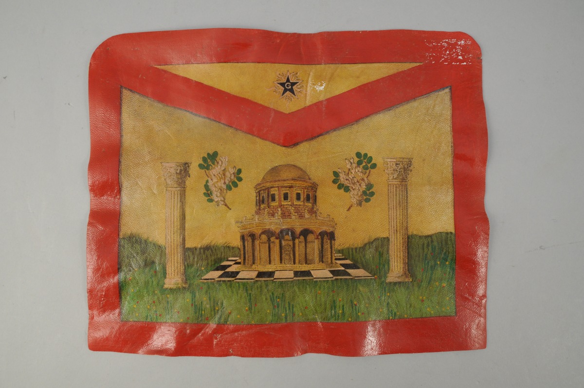 TABLIER de MAITRE dit "à l'acacia" en peau teintée polychrome. Sur le plastron, un tempieto sur un dallage noir et blanc encadré par deux colonnes corinthiennes et deux branches d'acacia. Faux rabat à galon avec étoile centrée d'un "G". XXème. Long. 27, Larg. 22 cm.