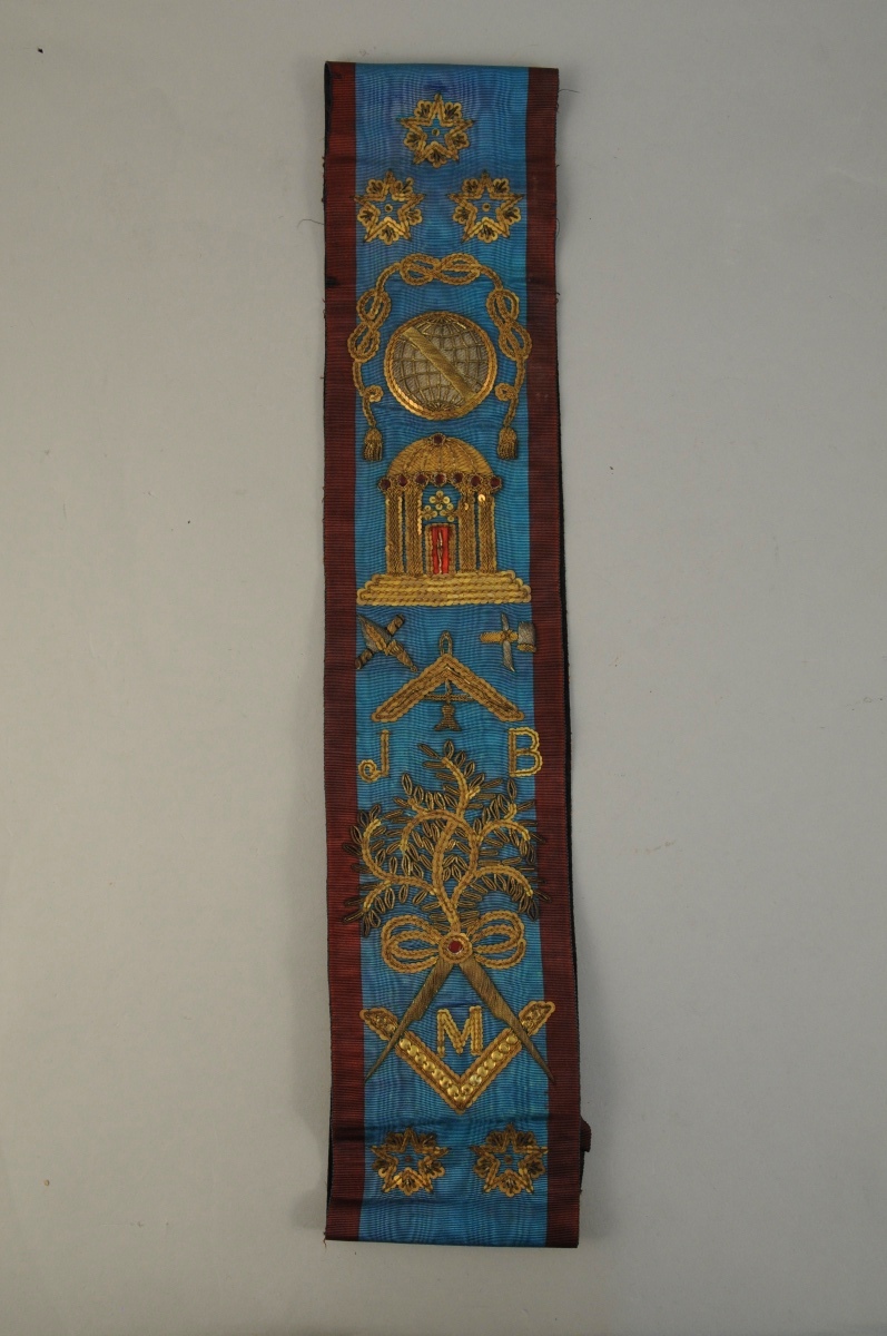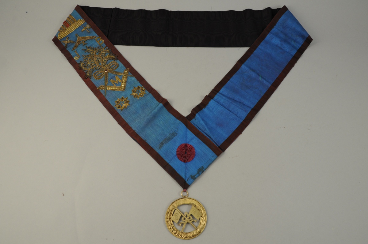 COLLIER en moire bleu et bordeaux, strass et fil doré. Décor d'étoiles, corde nouée, globe, perpendiculaire, temple, compas, équerre et feuillages. Marqué "J.B". Rosette bordeaux et médaille en métal doré représentant deux drapeaux rubanés dans une couronne de feuillages. Début XXème. Haut. 87,5 cm.