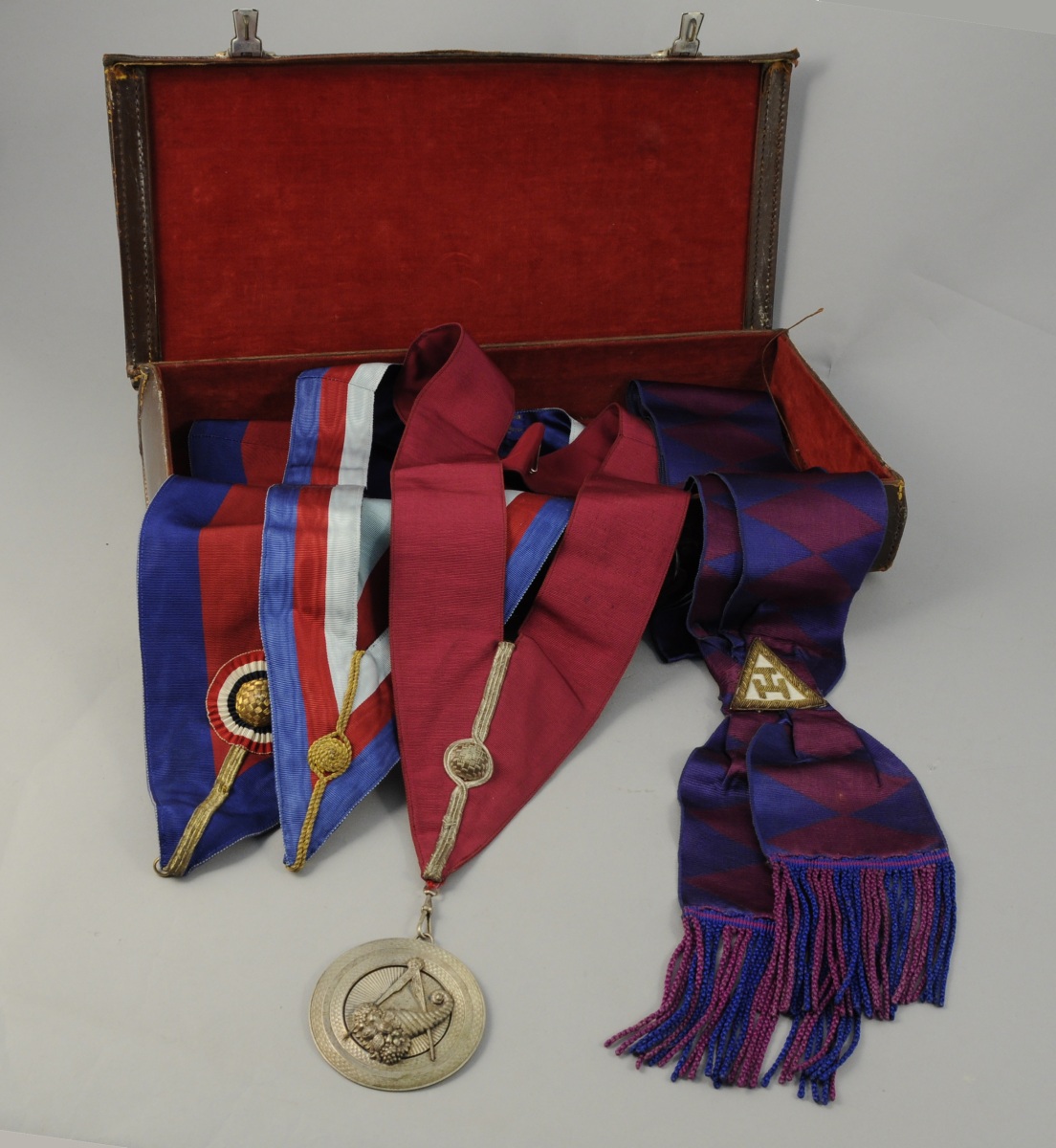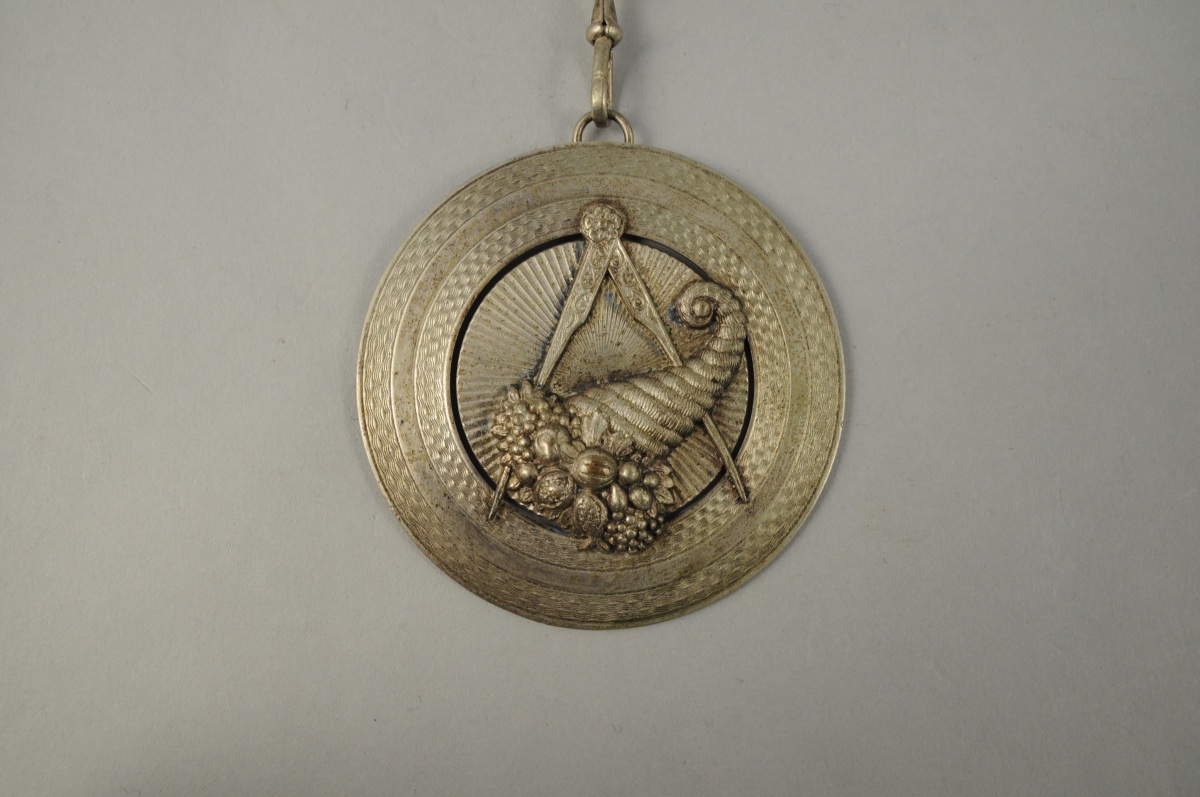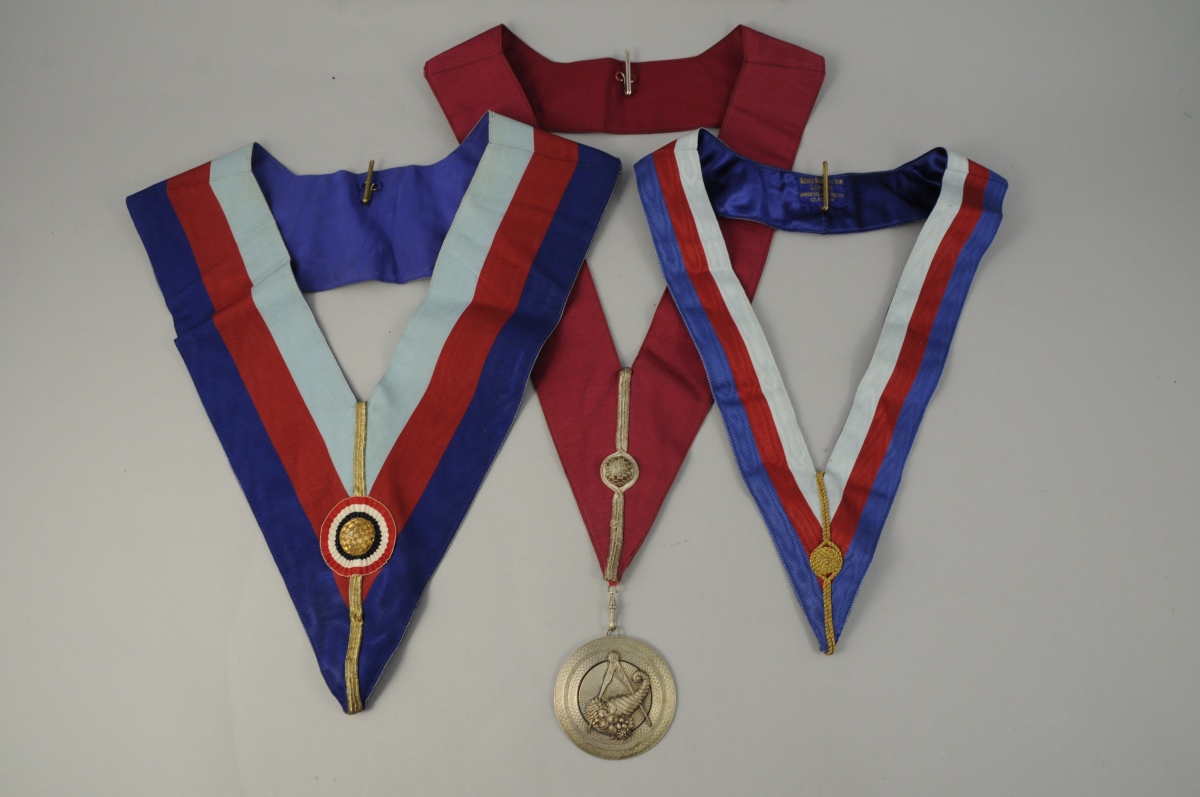 - QUATRE COLLIERS en tissu cotelé, galons et fil doré. L'un portant une médaille en argent ornée d'un compas et d'une corne d'abondance. XXème. Haut. 67 cm, pour le plus grand.