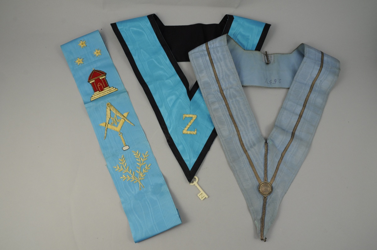 - CINQ COLLIERS en tissu bleu, galons et fil doré. L'un portant un pendentif en forme de clé. XXème. Haut. 83,5 cm, pour le plus grand.