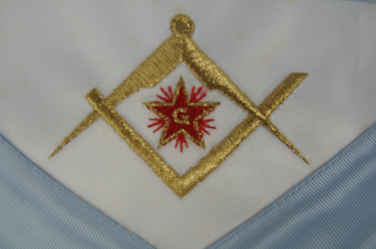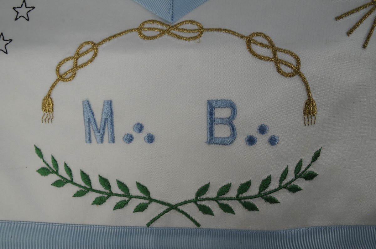 - TABLIER en peau teintée blanc, moire bleu ciel, fil doré et de couleur. Faux-rabat à galon orné du compas et de l'équerre centrés d'une étoile. Sur le plastron, un décor d'étoiles, lune, soleil, corde nouée et feuillages. Marqué "M.B". Cordon de taille. XXème. Long. 39,3, Larg. 31 cm.