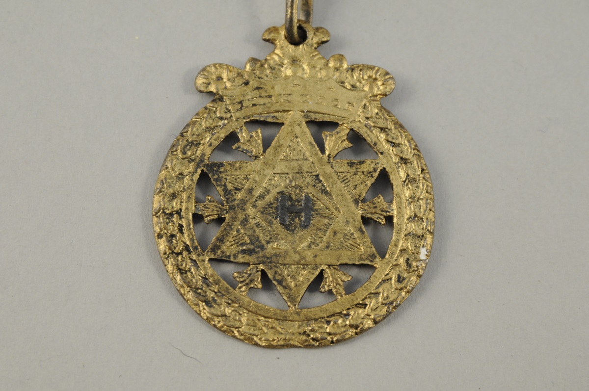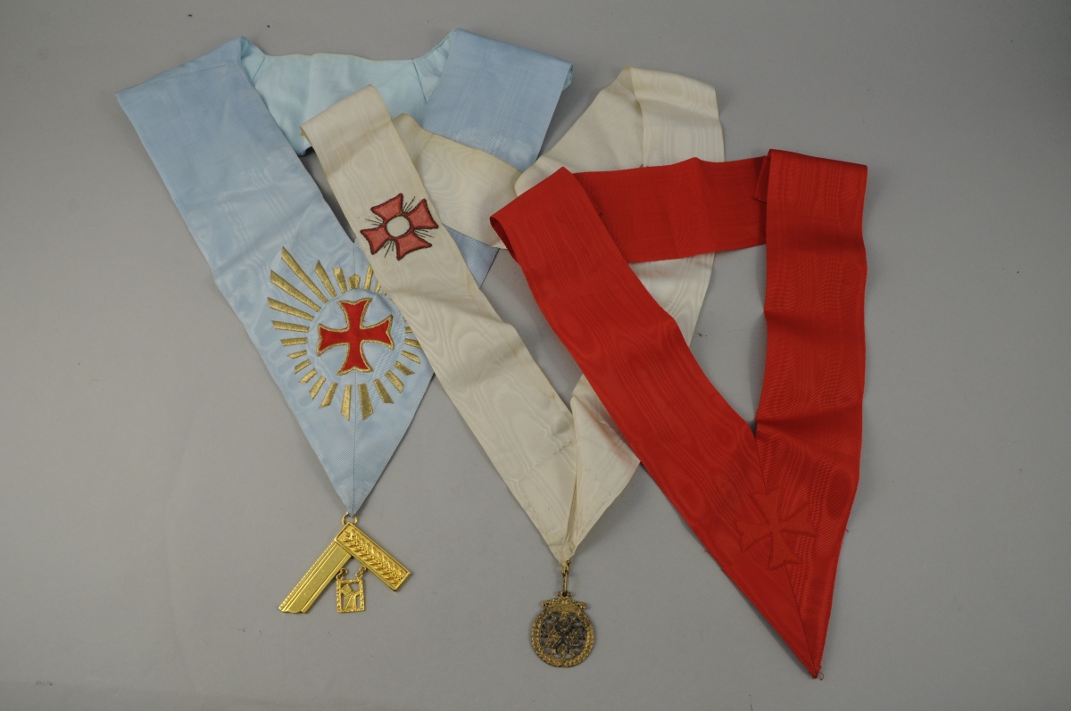 - COLLIER en moire blanche. Croix pâtée rouge brodée. Médaille ajourée d'une étoile centrée de Saint-André crucifié et d'un "H". XXème. Haut. 76,5 cm.