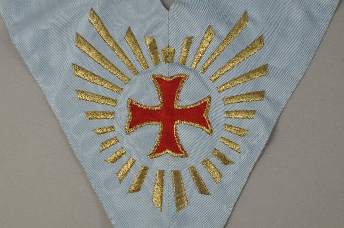 - COLLIER en moire rouge. Croix de l'Ordre du Temple en feutre rouge brodée sur la pointe. XXème. Haut. 53 cm.