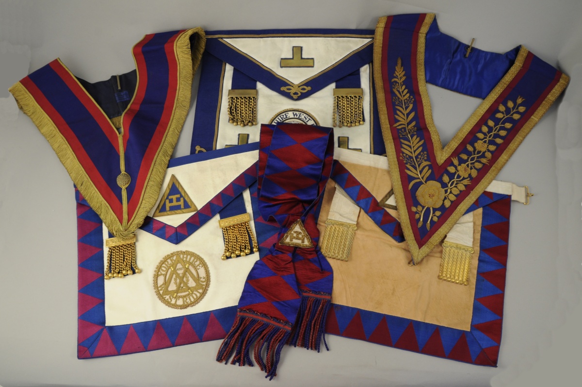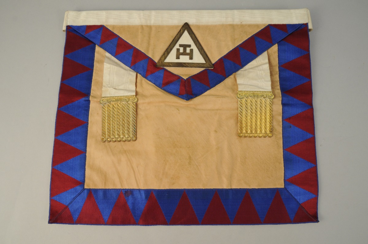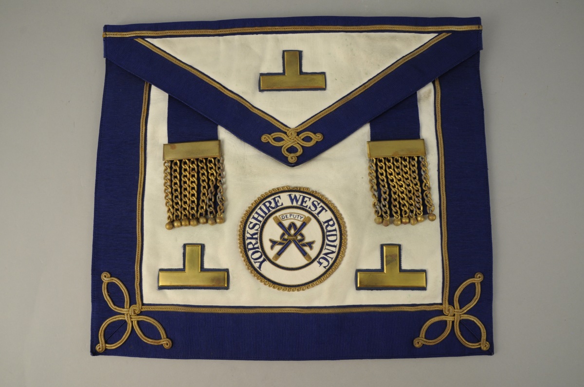 - TROIS TABLIERS en peau et tissu cotelé bleu et pourpre, dont deux provenant de la loge Yorkshire West Riding. Deux attaches en métal doré auxquelles sont accrochés sept pendrillons terminés par des boules. Rabat à galon. XXème. Long. 39,3, Larg. 34,9 cm, pour le plus grand.