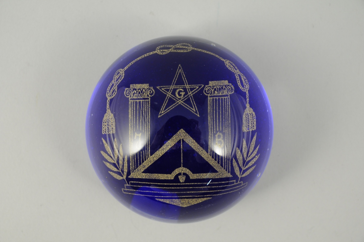 PRESSE-PAPIER SULFURE en verre à décor d'attributs maçonniques or sur fond bleu. Milieu XXème. Diam. 8 cm.