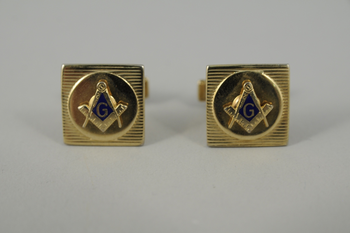 PAIRE de BOUTONS de MANCHETTES carrés plaqués or et émaillés bleu. Décor appliqué, dans un médaillon, du compas et de l'équerre centrés d'un "G". Dans un écrin bleu marqué "Jacques Simon / joaillier / RUEIL". XXème.