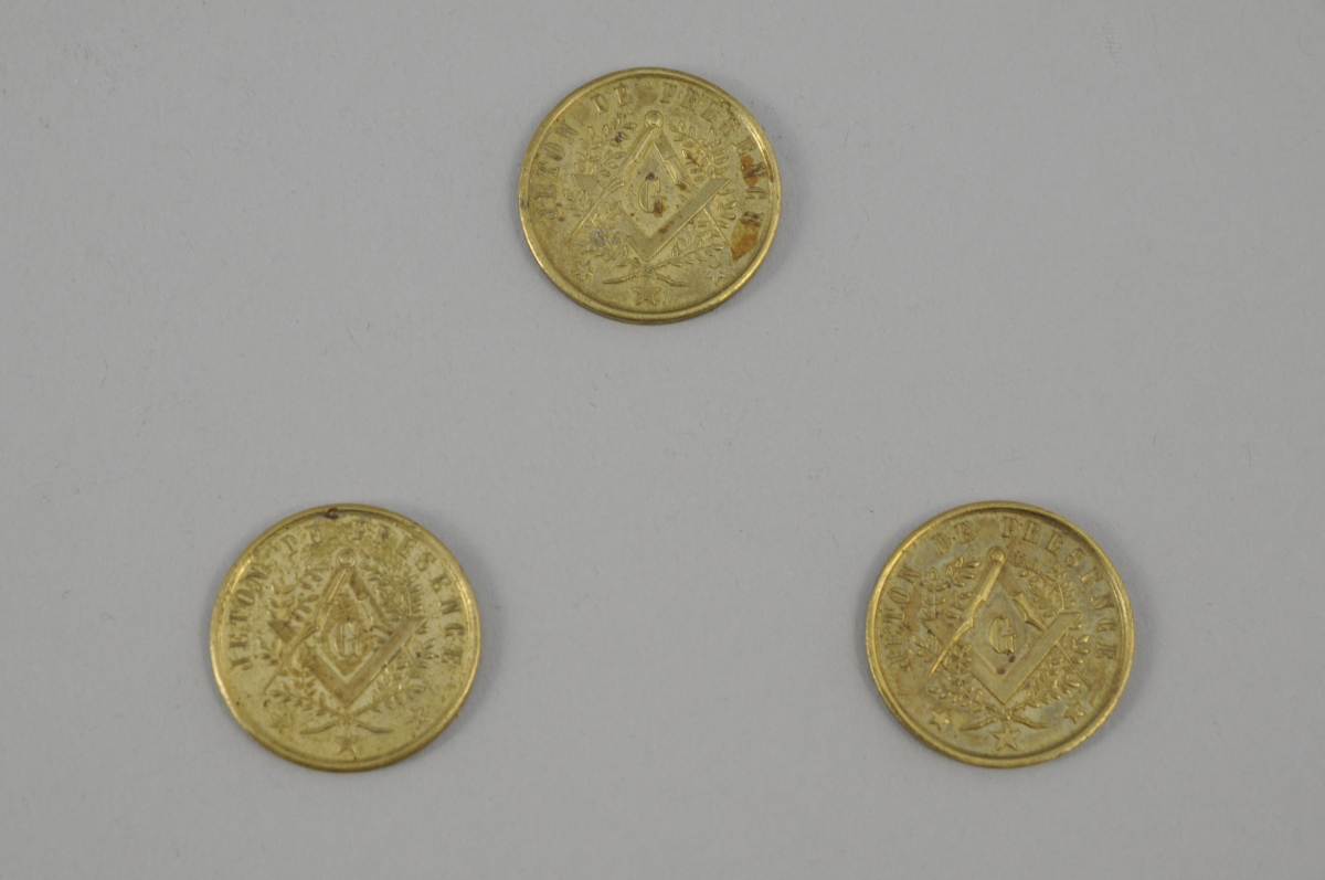 TROIS JETONS de PRÉSENCE en cuivre de la loge Bonaparte, fondée en 5852. Abeille impériale sur l'avers. Compas et équerre centrés d'un "G", couronne de feuillages et trois étoiles sur le revers. Diam. 2,2 cm.