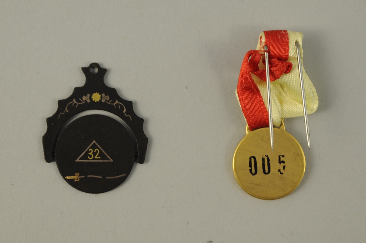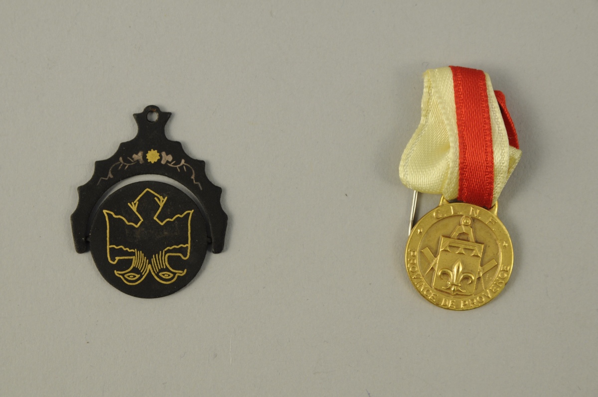 LOT de DEUX PETITES MÉDAILLES. L'une du 32ème, Petit Livitant en métal laqué noir, argent et or. L'autre, G.N.L.F, province de Provence, en métal doré avec ruban. Fin du XIXème. Haut. 3,4, Diam. 1,9 cm.