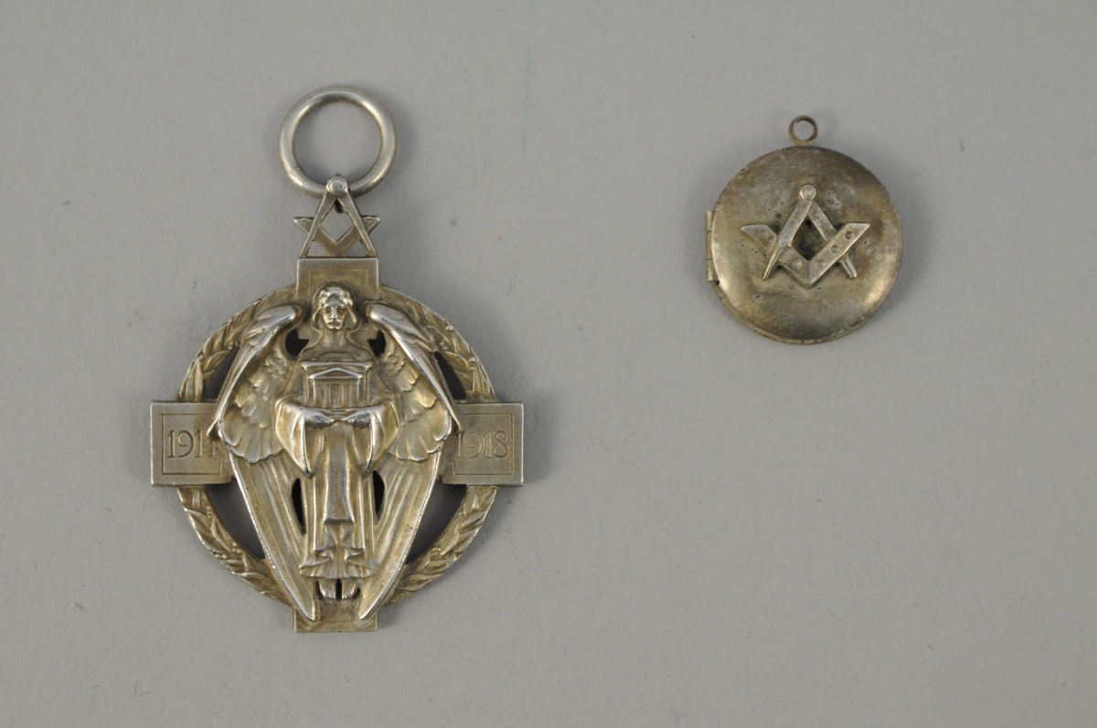 MÉDAILLE commémorative en argent. Décor d'une couronne de lauriers ajouré d'une croix centrée d'une Victoire portant un temple et sommé du compas et de l'équerre. Datée 1914-1918. Marquée au revers "W. Bro W. A. Fletcher". XXème. Haut. 4,7 cm.