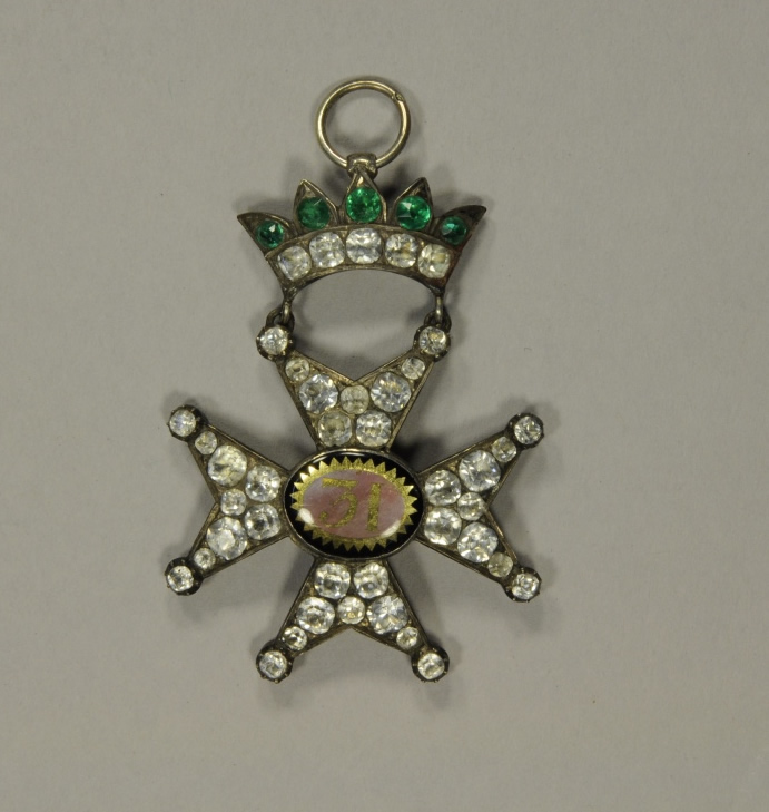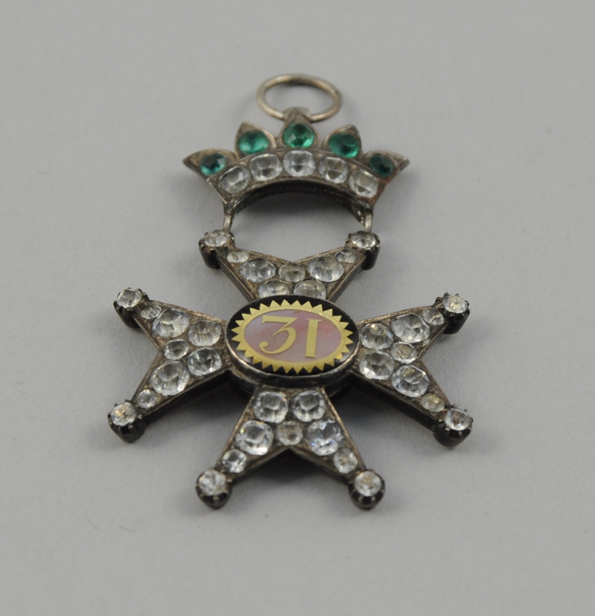 BIJOU de GRAND INSPECTEUR INQUISITEUR en métal argenté et pierres de couleur prenant la forme d'une Croix de Malte surmontée d'une couronne. Au centre, sur fond nacré rose, le chiffre "31" et deux épées croisées au revers. XIXème. Haut. 7,2 cm.