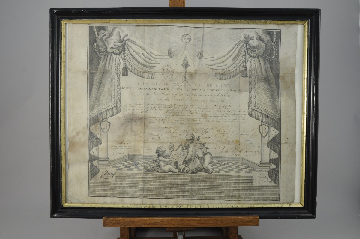 DIPLÔME de MAÎTRE de la loge des Amis Fidèles du Grand Orient de France, décerné à Pierre FLEURY, à Paris, en 1814. Dans un cadre. 37,7 x 48 cm. (usures et tâches)