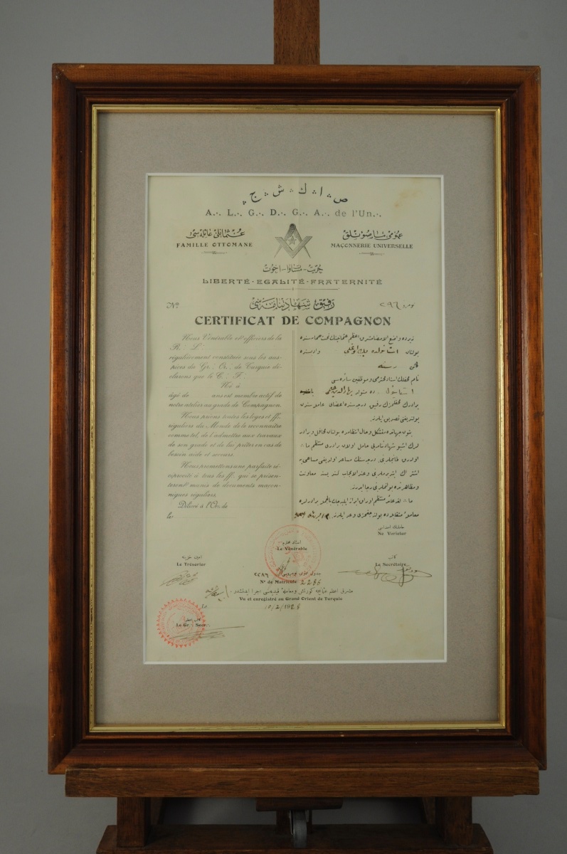 CERTIFICAT de COMPAGNON du Grand Orient de Turquie décerné le 10 février 1928. N°2286. Dans une cadre en bois naturel. 21 x 34,8 cm.
