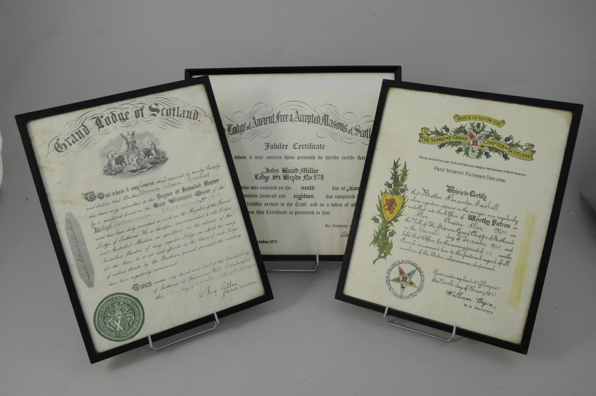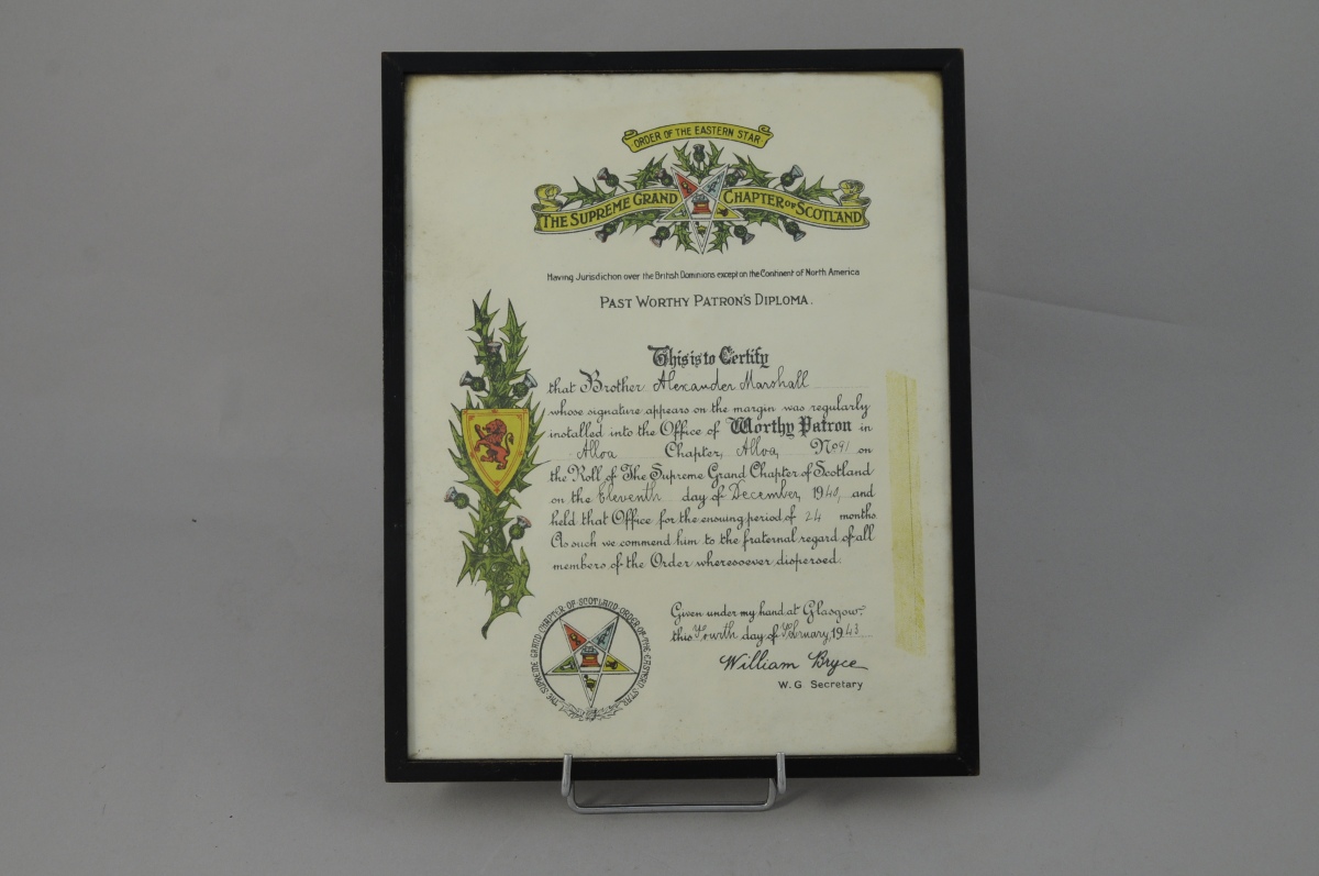 ENSEMBLE comprenant DEUX DIPLÔMES de MAÎTRE et "WORTHY PATRON" de la Grand Lodge of Scotland et du Supreme Grand Chapter of Scotland décernés à Alexander MARSHALL, en 1942 à Edinburgh et en 1943 à Glasgow. Cadres en bois peint. 23 x 30,4 cm.